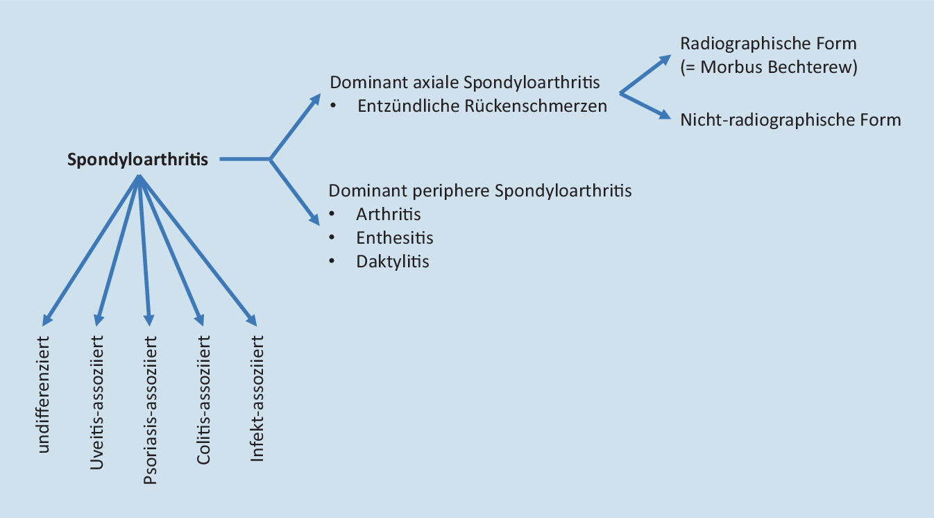 Die strukturelle Bildgebung erlaubt die Einteilung der axialen SpA in die nichtradiographische und die radiographische Form (letztere auch Morbus Bechterew genannt) (Abb. 1). Bei der radiographischen Form kann noch zwischen der Beteiligung der Iliosakralgelenke und der Wirbelsäule unterschieden werden, wobei die alleinige Beteiligung der Wirbelsäule ohne Beteiligung der Iliosakralgelenke nur selten vorkommt.
