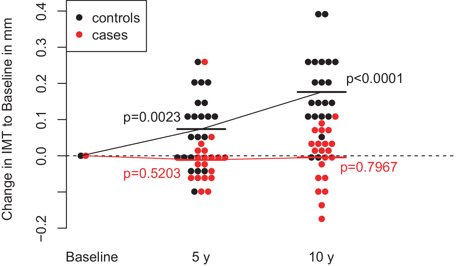 Change in C‑IMT in mm to Baseline after 5 years and 10 years of follow-up in cases and controls; mean values are shown for cases and control group as horizontal lines; p-values are derived from paired t‑tests comparing the respective follow-up-values with baseline values. C‑IMT carotid intima media thickness