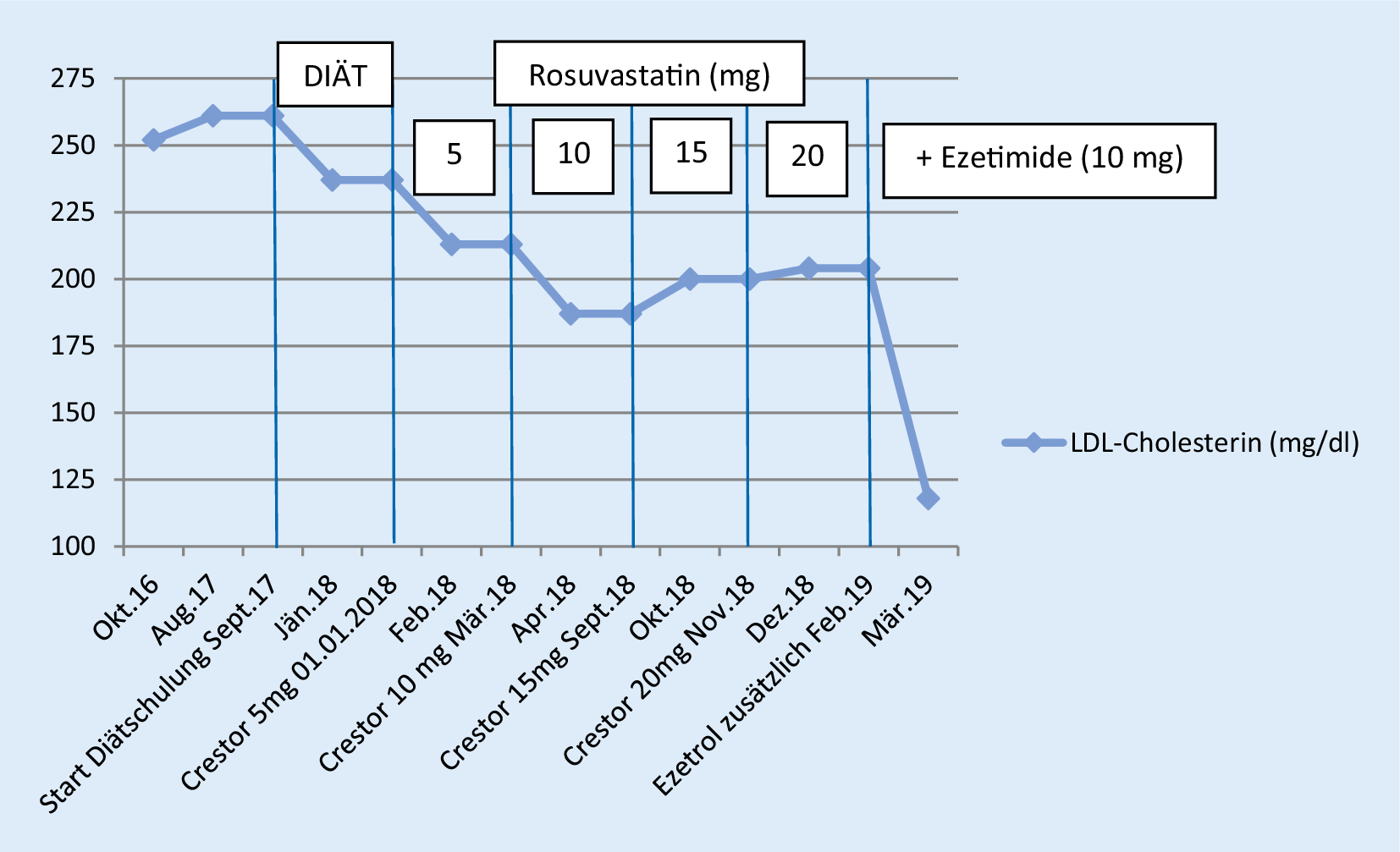 Im Januar 2018 wird zusätzlich eine medikamentöse Therapie mit 5 mg Rosuvastatin/Tag gestartet, wodurch der LDL-C-Wert auf 213 mg/dl sinkt. Eine Erhöhung auf 10 mg Rosuvastatin/Tag im März 2018 bei völliger Nebenwirkungsfreiheit führt zu einem LDL-C-Wert von 187 mg/dl. Trotz einer Erhöhung von Rosuvastatin auf 15 mg/Tag kommt es im September 2018 wieder zu einem LDL-C-Wert von 200 mg/dl und im November 2018 bei einer Steigerung von Rosuvastatin 20 mg/Tag zu einem LDL-C Wert von 204 mg/dl.