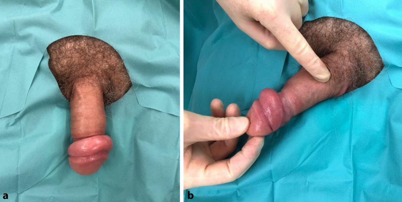 Ein 56-jähriger Patient stellte sich bei zunehmender Schwellung und Schmerzen im Bereich des Penis notfallmässig vor. Die Symptome hatten schleichend vor 2 Tagen begonnen, bei anamnestisch enger Vorhaut. Mit zunehmender Schwellung entwickelte sich ein Spannungsschmerz, gefolgt von einer Parästhesie im Bereich der Penisspitze. Miktionsbeschwerden, Makrohämaturie, urethraler Ausfluss oder autoerotische Handlungen lagen anamnestisch nicht vor. Die Sexualanamnese war bland. Klinisch zeigte sich eine zirkuläre, ödematöse, gerötete, druckempfindliche Schwellung ohne Überwärmung im Bereich des distalen Penis mit freiliegender Glans (Abb. 1a, b). Das Skrotum und die restliche körperliche Untersuchung waren unauffällig.