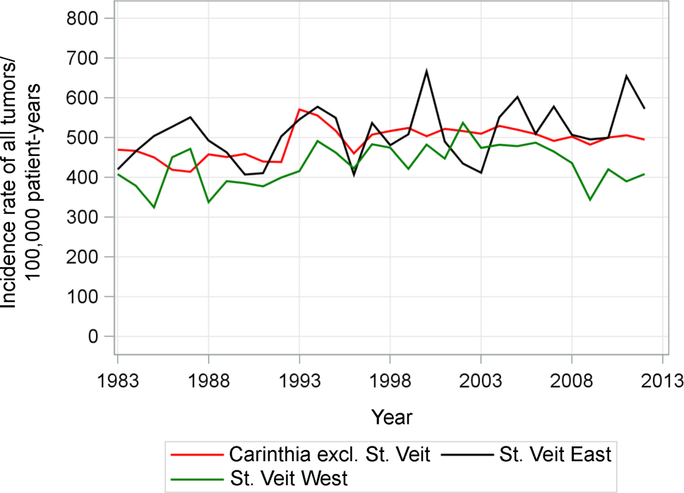Direct age-standardized rates of all malignancies in St. Veit East, St. Veit West and Carinthia including St. Veit/Glan as well as Carinthia excluding St. Veit/Glan were calculated. For tumor-specific analysis, incidence rates were combined into 5‑year intervals because of the low incidence of some cancers. Direct age-standardized rates and corresponding 95% confidence intervals (CI) were calculated in SAS 9.4 (SAS Institute Inc., Cary, NC, USA) using the European standard population (Annex F, p. 121 Revision of the European Standard Population Report of Eurostat’s task force, 2013 edition). Rates are expressed as cases per 100,000 person-years. Due to the lack of a priori hypotheses, no statistical tests for time trends or comparing incidence rates between regions were performed.