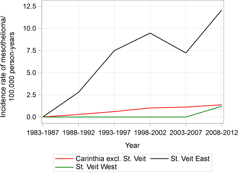 For liver cancer, the incidence increased in St. Veit East, St. Veit West and Carinthia until 2008 and then decreased until 2012. St. Veit East had a higher incidence than St. Veit West and Carinthia for the majority of the studied period (5/6 of 5‑year intervals from 1983 to 2012). Lung cancer incidence was stable throughout the studied time period in all of Carinthia as well as St. Veit East. The incidence in St. Veit West decreased beginning with the period 1988–1992. Male mesothelioma incidence significantly increased in Austria overall during the studied period (from 2.9 to 4.4) [6]. In Carinthia, there was a slight increase in mesothelioma incidence rate (from 0 to 1.4) (Fig. 2; Table 2). St. Veit East had a higher incidence rate than St. Veit West throughout and increased steadily (2.8–12.1).