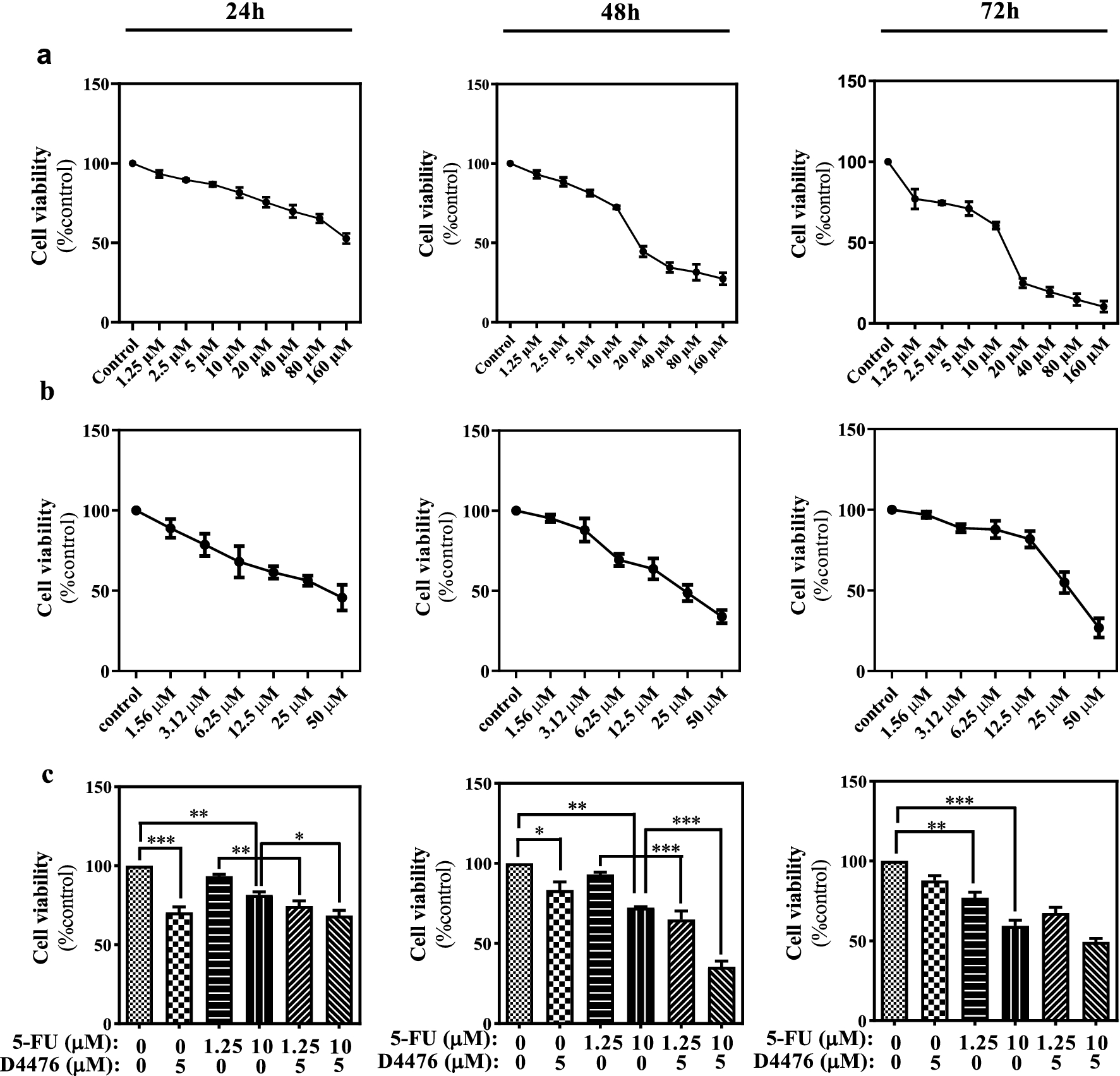 The effect of 5-FU, D4476 and combination of D4476 with 5-FU on the growth of HCT-116 colon cancer cells. The cells were exposed to different concentrations of 5-FU (a), D4476 (b), and combination thereof (c), for 24 h, 48 h and 72 h, and the cell viability, was assessed by MTT assay. Data are reported as mean ± SD of three independent assays (n = 3, *P < 0.05; **P < 0.01; ***P < 0.001)