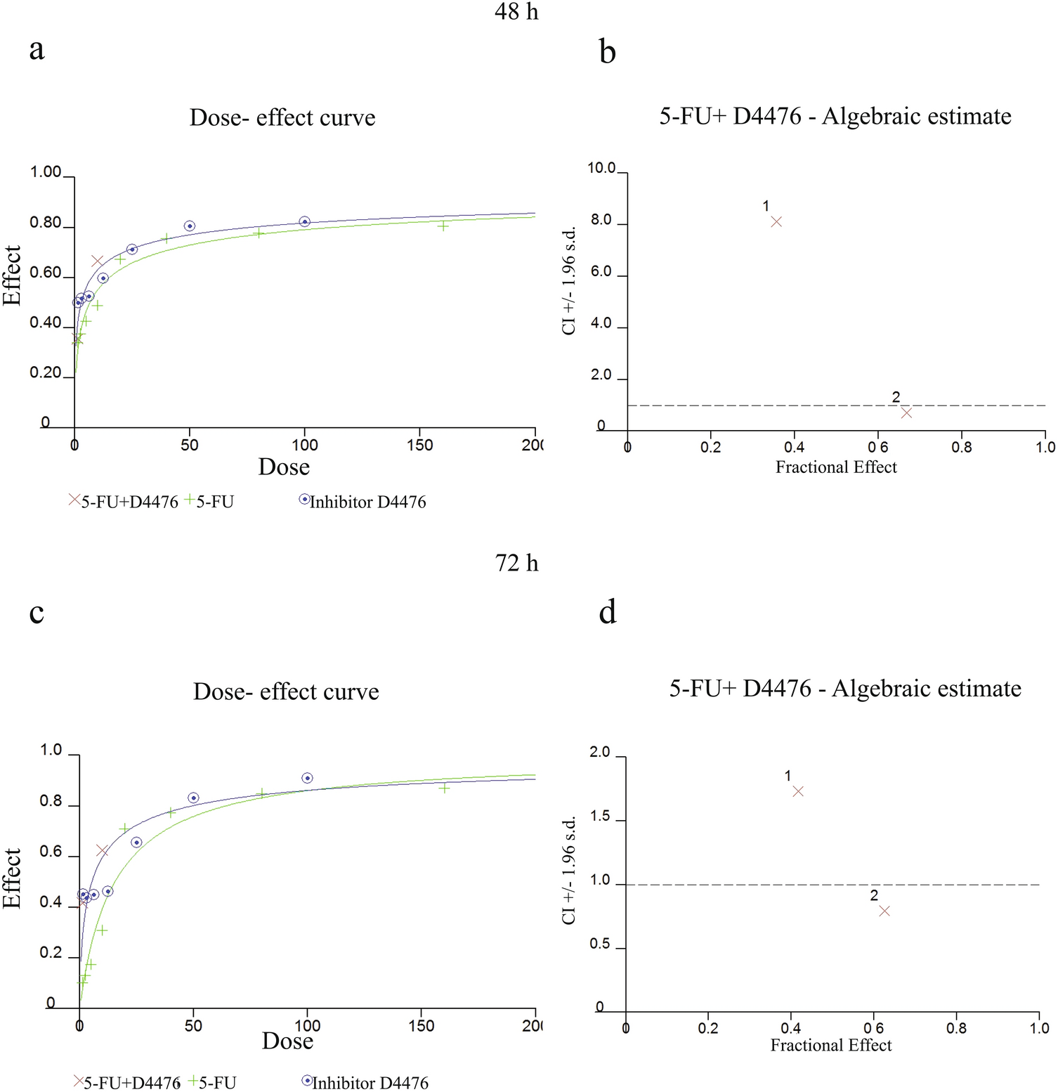 Synergistic interaction of D4476 with 5-FU in HCT-116 colon cancer cells. Dose–effect curve for HCT-116 colon cancer cells (a, c). CI-fractional effect curves for HCT-116 colon cancer cells (b, d)