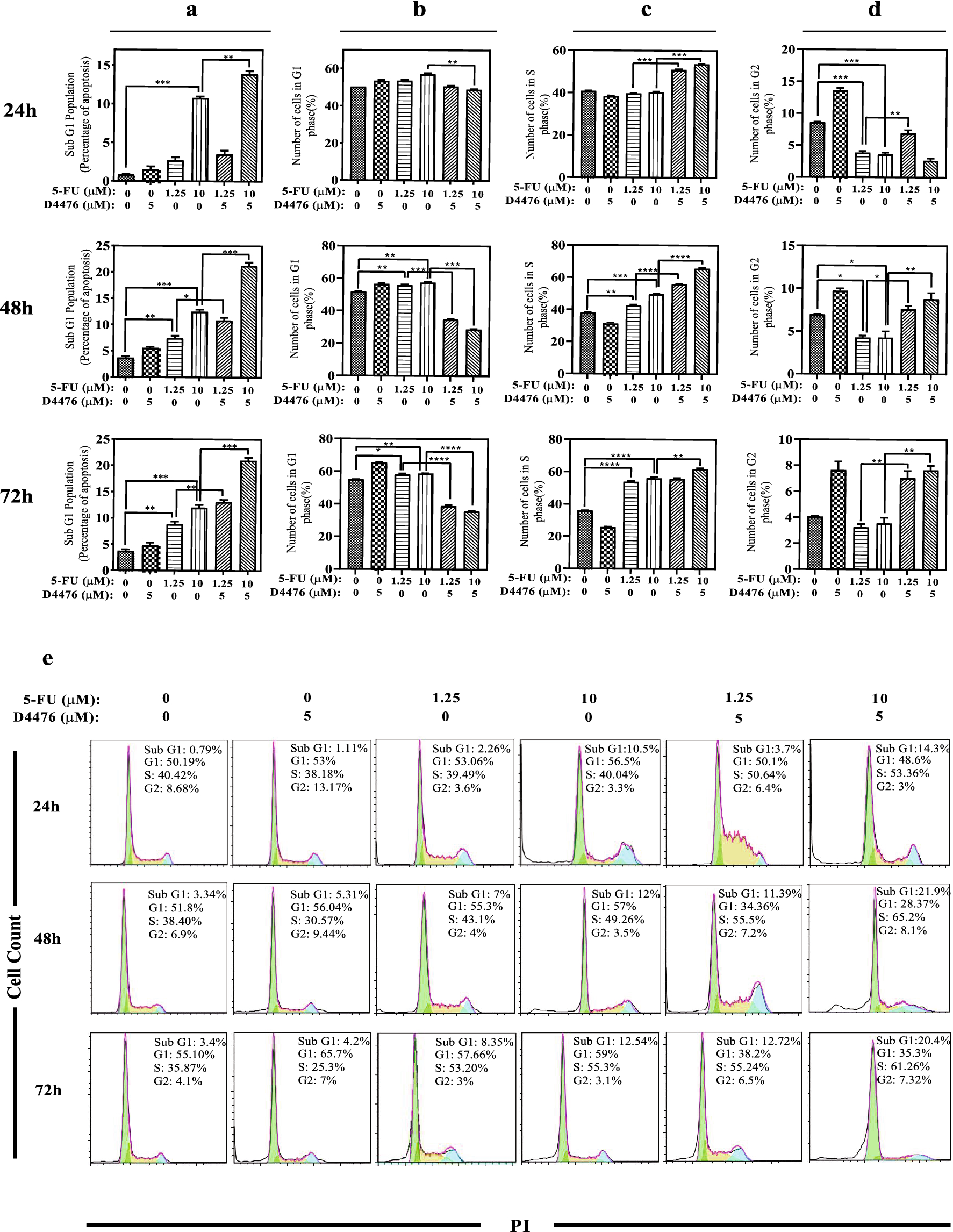Cell cycle distribution after HCT-116 cells were exposed to 5-FU and D4476 alone or in combination at 24, 48 and 72 h. Quantification of the sub-G1 (a), G1 (b), S (c) and G2 (d), population (bars represent percentage of cells [%] in each fraction). Flow cytometry histograms indicating cell cycle distribution and apoptosis (sub-G1) after HCT-116 cells were exposed to 5-FU and D4476 alone or in combination for 24, 48 and 72 h (e). Data are reported as means ± SD of three independent assays (n = 3, *P < 0.05; **P < 0.01; ***P < 0.001)