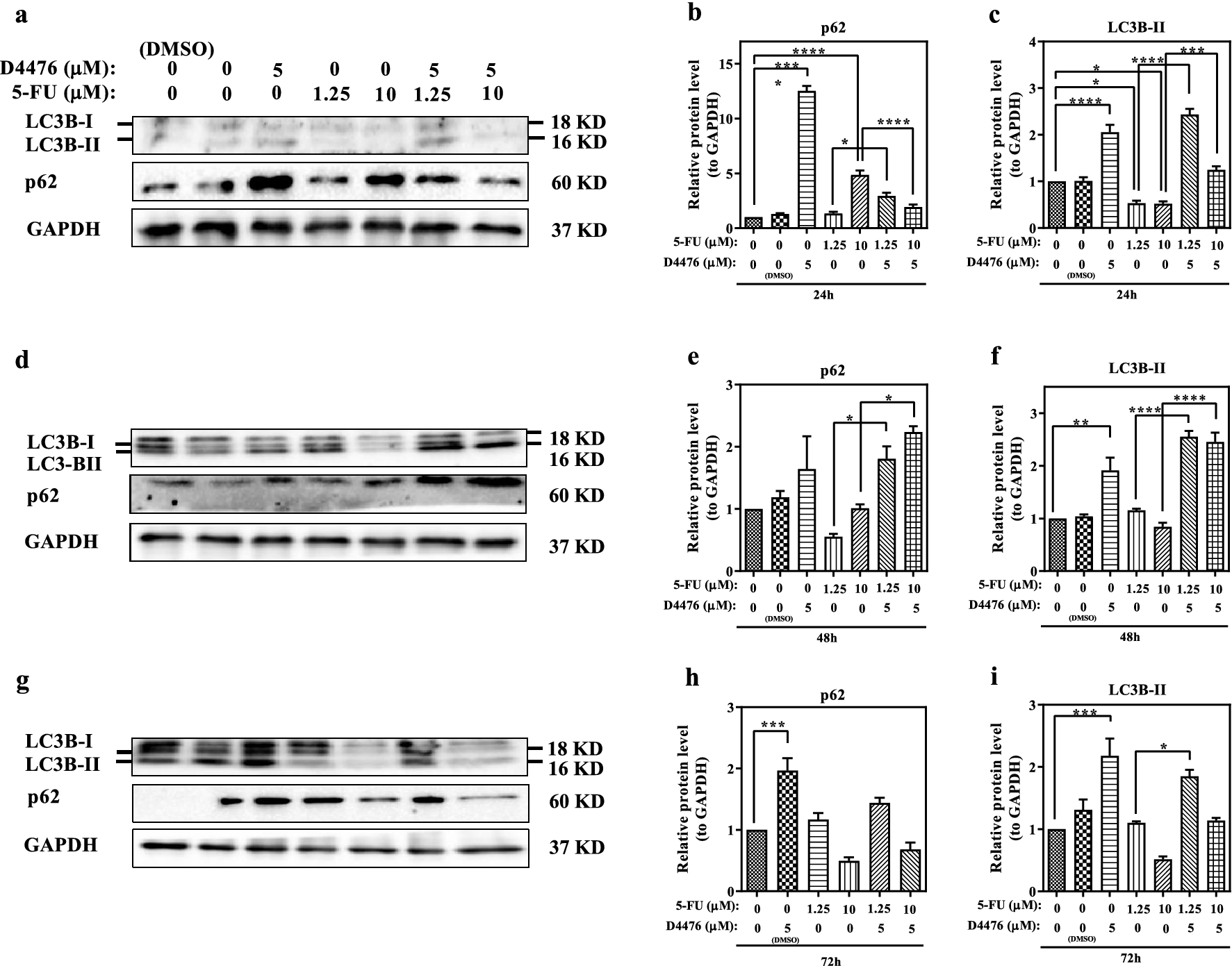 An increased expression of P62 in the cells treated with the 1.25 µM 5-FU and D4476 combination was detected by western blot, compared with the 5-FU alone at 24 h (P < 0.05), while the combination of 10 µM 5-FU and D4476 significantly decreased the p62 expression (P < 0.0001, Fig. 5a–c). In the combined treatment groups, the p62 expression significantly increased, compared with 5-FU alone at 48 h (Fig. 5d–f, P < 0.05). However, this increase was not significant after 72 h.