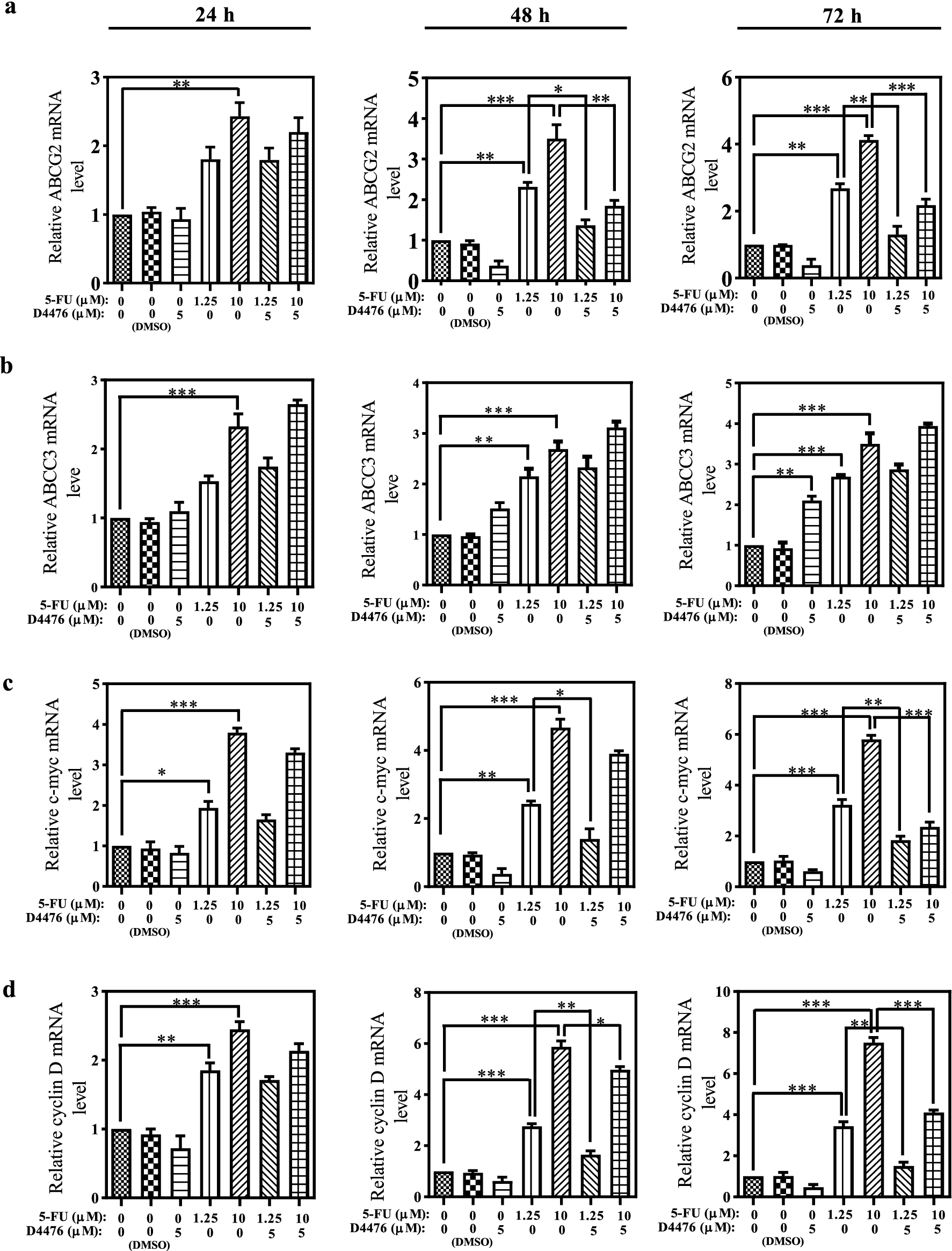 Quantitative real-time polymerase chain reaction (RT-PCR) was performed as described previously (Hashemi et al. 2013; Karami et al. 2020). Briefly, the cells were covered with specific concentrations of 5-FU (10 and 1.25 μM), D4476 (5 μM), and the combination of 5-FU and D4476 for 24, 48, and 72 h. The total RNA was isolated by the RNX-Plus RNA extraction kit (Cinnagen, Iran), following the manufacturer’s instruction, and then RNA quantity and quality were assessed by electrophoresis and a Nano Drop spectrophotometer (Thermo Scientific, USA) (260/280 nm ratio). cDNA was made by the cDNA Synthesis Kit (Thermo Fisher Scientific, USA) and amplified in the presence of specific primers (Table 1). The ABCC3 (GenBank accession no. NM-003786.4), ABCG2 (GenBank accession no. NM-004827.3), c-myc (GenBank accession no. NM-002467.6), Cyclin D1 (GenBank accession no. NM-053056.3), Beclin1 (GenBank accession no. NM-003766.4) and GAPDH (GenBank accession no. NM-002046.7) primers were obtained from Metabion (Germany). Quantitative RT-PCR was performed in an ABI real-time PCR 7500 system (Applied Biosystems, USA). GAPDH was considered as a reference control. The relative quantity of the target genes was calculated, using the delta-delta Ct (2–ΔΔCT) method.