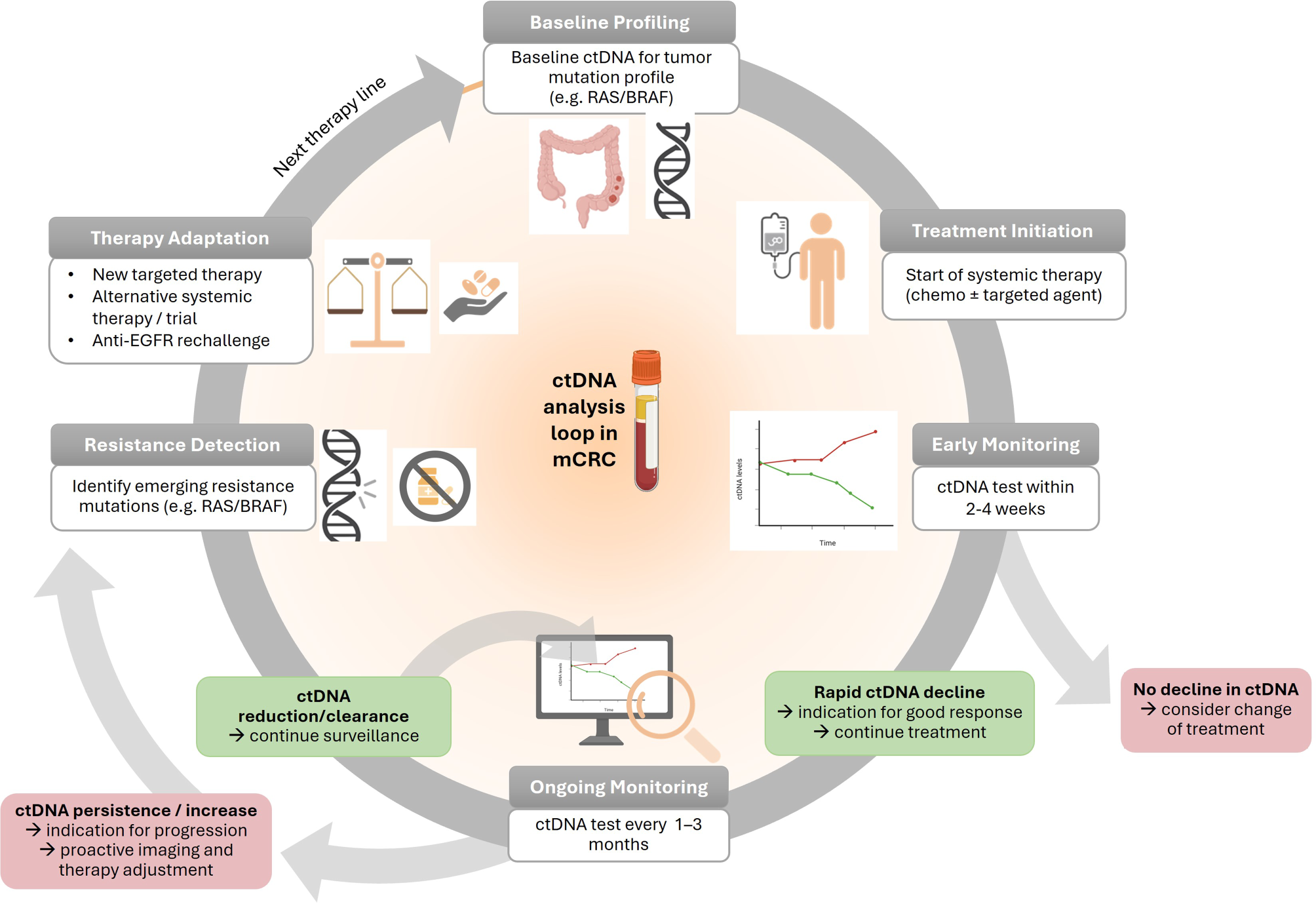 While ctDNA in localized CRC often serves as a binary marker of MRD, in metastatic CRC (mCRC) it is best understood as a dynamic monitoring tool that informs therapeutic choices throughout the disease course [18]. Its value lies in enabling identification of actionable targets, monitoring of emerging resistance, and assessment of treatment response in real time. Together, these applications create an iterative framework where ctDNA continuously guides therapy adaptation. A conceptual framework can be envisioned as a circular loop including baseline profiling, early monitoring, serial surveillance, detection of resistance, and therapy adaptation until the next cycle (Fig. 2).