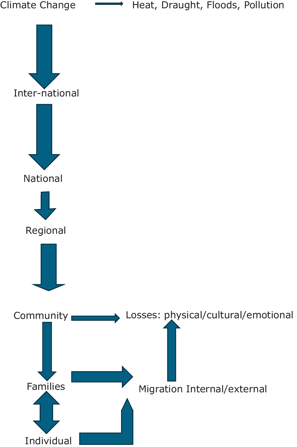 Severe weather events—such as floods, droughts, wildfires, and heatwaves—are significantly associated with increased prevalence of certain psychiatric conditions as mentioned above. Climate change impacts at various levels: these include at individual, family, community, local, regional, national and international levels. And the response at each level will be different and possibly complex. These consequences can be caused by but also lead to forced involuntary acts of migration, loss of status, stress, psychiatric disorders, etc, which further add to loss of emotional stability, sense of belonging, and the psychological wellbeing of entire communities (see Figure 1). In this context, climate change emerges as a salient contributor to what has been described as “polycrisis.” This situation reflects a convergence of interdependent crises that collectively undermine human capabilities, long-term prospects, and overall wellbeing. This further brings complexity to an already complex field where socio-psycho-bio-spiritual-anthropological factors contribute to etiology of various psychiatric disorders as well as therapeutic interventions. Various authors have argued persuasively for prioritizing preventive and adaptive interventions [3‐5]. These factors are likely to have major and serious impact on design and delivery of psychiatric services.