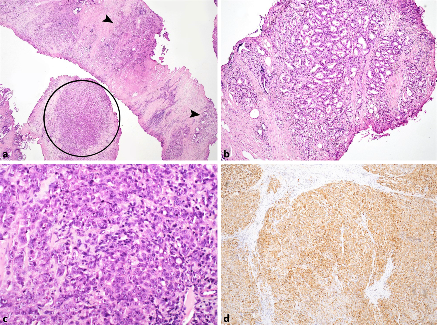 Morphological and immunohistochemical findings of the prostate tumor. a Two components are present: typical adenocarcinoma (arrowheads) and a poorly differentiated carcinoma (circle) (hematoxylin and eosin [H&E] ×20). b Typical adenocarcinoma is composed of irregular glandular structures (H&E ×40). c A poorly differentiated component composed of sheets of enlarged atypical cells with visible nucleoli (H&E ×400). d Immunohistochemical PSA staining shows diffuse expression (×400)