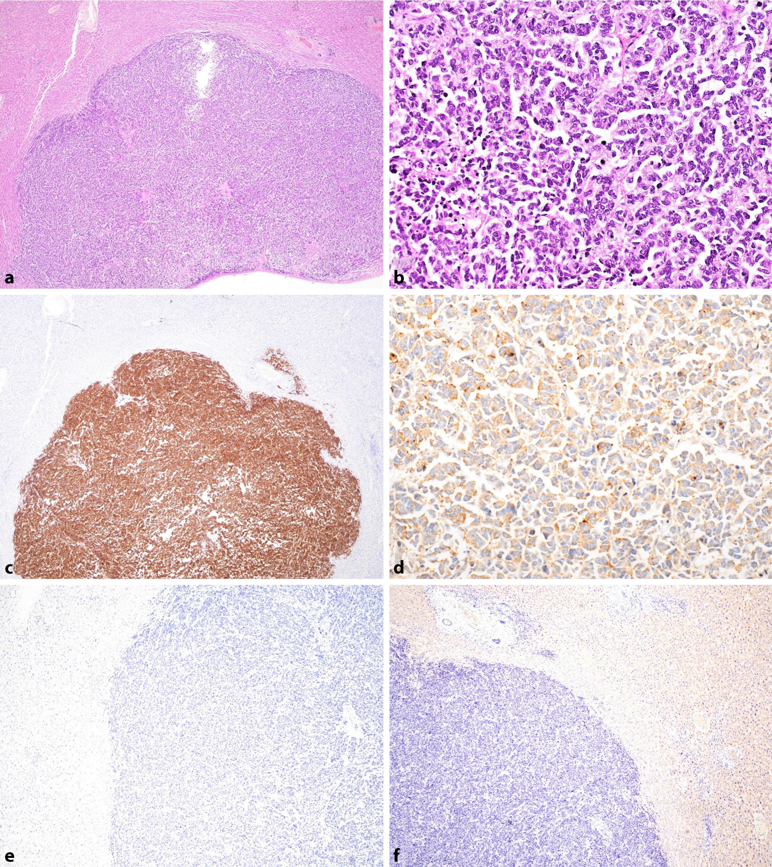 The liver metastases were composed of sheets of tumor cells with an endocrine phenotype (Fig. 2a, b) and mitotic activity. Immunohistochemistry showed labelling for synaptophysin and VIP (Fig. 2c, d). PSA, prostein and chromogranin A stains were negative (Fig. 2e, f). These findings suggested the diagnosis of well-differentiated neuroendocrine tumor metastases with VIP expression.