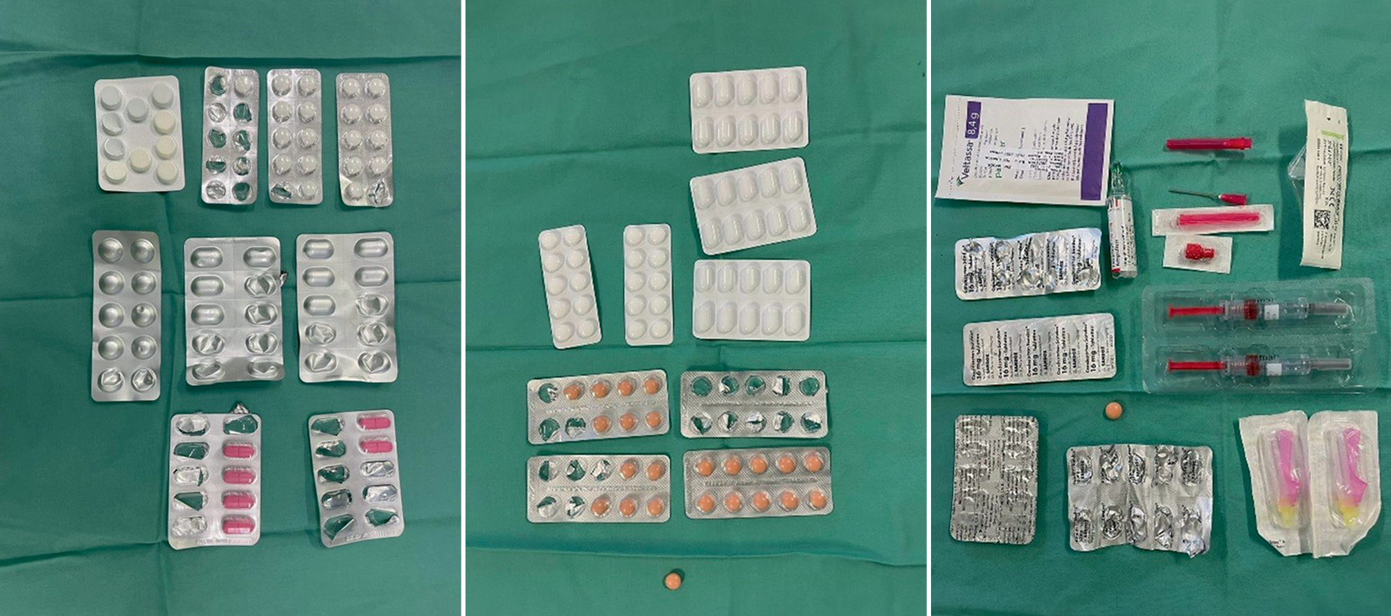 As summarized by Dr. Mayer, this case of proteinuria was really challenging because of various discrepancies between the history, clinical presentation, histology and laboratory data; however, soon after admission it became clear that the patient was faking kidney disease, i.e., albuminuria, acute renal failure and hyperkalemia by adding human albumin to her urine and abusing diuretics (loop diuretics and aldosterone antagonists), antihypertensives (ACE inhibitor, AT2 blocker and urapidil), NSAIDs and KCl tablets. All these drugs were found in the patient’s handbag on a room search (Fig. 1). Furthermore, urinalysis clearly showed misuse of diuretics (Table 1). Moreover, we found acetylsalicylic acid tablets and low molecular weight heparin for subcutaneous application in the patient’s handbag, which she had administered herself (multiple puncture sites were found on her body) and we speculated that these drugs might have led to the postinterventional bleeding after the renal biopsy. In the intensive care unit, urine obtained by a urine catheter was negative for protein. Confronted with these findings and the laboratory data, the patient admitted to faking kidney disease, which therefore confirmed the diagnosis of factitious disease. A psychiatrist was consulted.