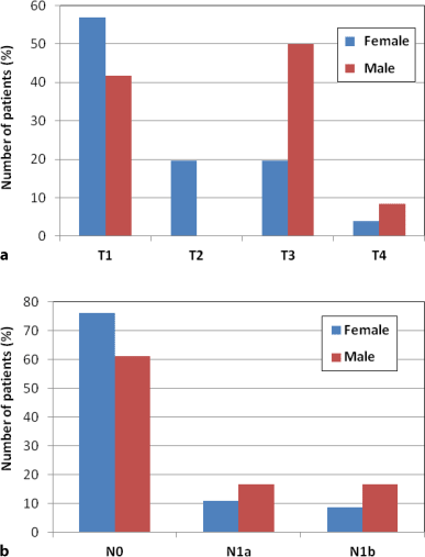 T1 tumors were found in 34 patients (54%). Of these patients, 20 patients (32%) had a pT1a tumor and 14 patients (22%) had a pT1b tumor. T2 tumors were diagnosed in 10 patients (16%), T3 tumors in 16 patients (25%), and T4 tumors in 3 patients (5%). Lymph node involvement was seen in 15 patients (24%) and metastatic disease (pulmonary metastases) in 1 patient (2%) with papillary thyroid cancer (pT3 N0 M1). Table 1 shows the distribution of T‑stage and N‑stage across histological type, finding, focality, and center. Fig. 1 illustrates the distribution of T‑stage and N‑stage across gender. Female patients with all histological types peaked at a younger age than male patients, except patients with medullary thyroid cancer. Local and vascular invasion were found in 7 (11%) and 5 patients (8%), respectively.