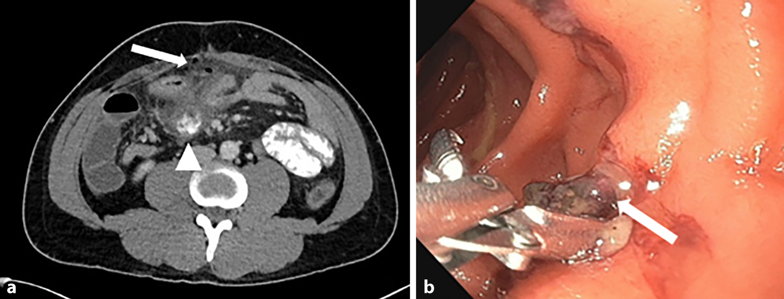 a Axial CT scan of the abdomen. Arrow showing free air in the abdominal cavity and signs of acute peritonitis. Arrowhead showing inflammatory process suggestive of abscess formation at the duodenum. b Gastroscopic view. Arrow showing the polymer clip protruding into the duodenum at the tip of endoscopic grasper