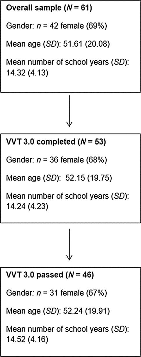 Participant flow chart showing descriptive characteristics of the sample over stages of exclusion. VVT3.0 Vienna Visuo-constructional Test [25], N sample size, n subsample size, SD standard deviation