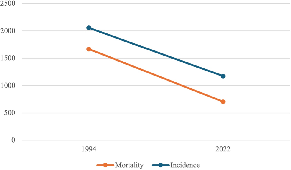 In 1994, there were 2057 newly diagnosed cases of gastric cancer in men and women, with an age-standardized rate of 33.9 per 100,000 persons. In 2022, the incidence was 1173, with an age-standardized rate of 12.5 per 100,000 persons.