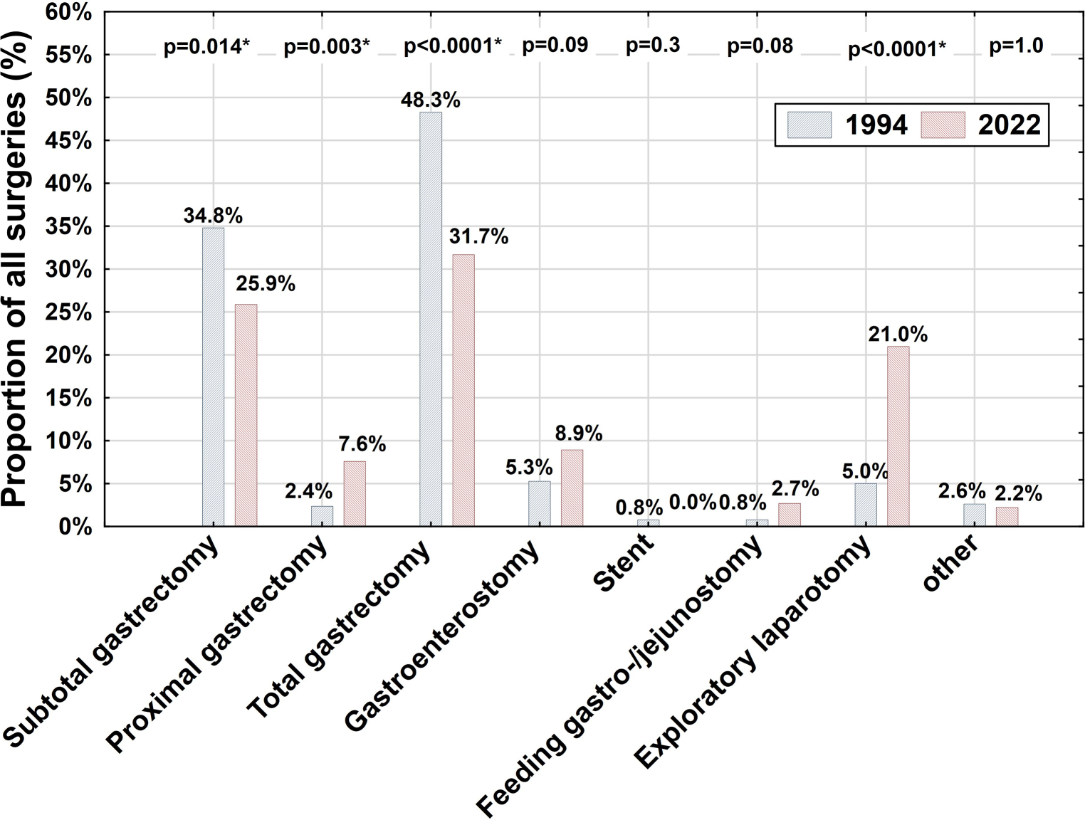 The most frequently performed operation was total gastrectomy in 1994, and it was still the most common in 2022. The number of total and subtotal gastrectomies decreased significantly over time (48.3% vs. 31.7%, p < 0.0001 and 34.8% vs 25.9%, p = 0.0.14, respectively). In contrast, proximal gastrectomy increased from 2.4% to 7.6% (p = 0.003). Diagnostic procedures are more frequently carried out nowadays, 21.0% vs 5.0% (p < 0.0001). As displayed in Fig. 4, no other significant changes were observed.