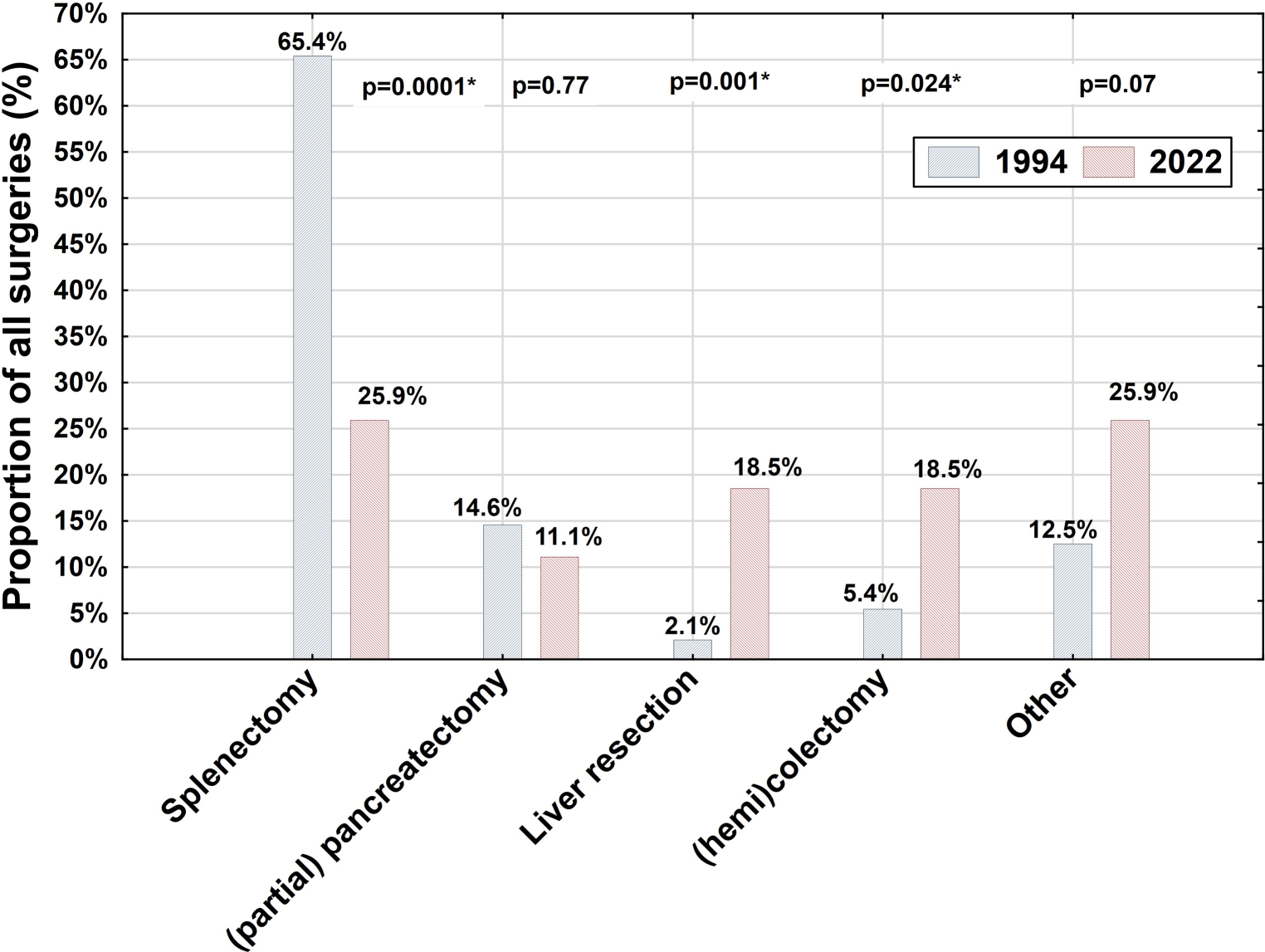 The most common extended resection was splenectomy in both observation periods. However, there was a highly significant difference in the frequency over time. In 1994, 157 splenectomies were performed, whereas only 7 splenectomies took place in 2022 (65.4% vs. 25.9% of all extended resections, respectively, p = 0.0001). Liver resections are now carried out more often, we documented 5 resections in 2022 (18.5%) vs. 2.1% in 1994 (p = 0.001). Also, the additional resection of the colon increased significantly, from 5.4% in 1994 to 18.5% in 2022 (p = 0.024). No further significant changes were found (Fig. 5).