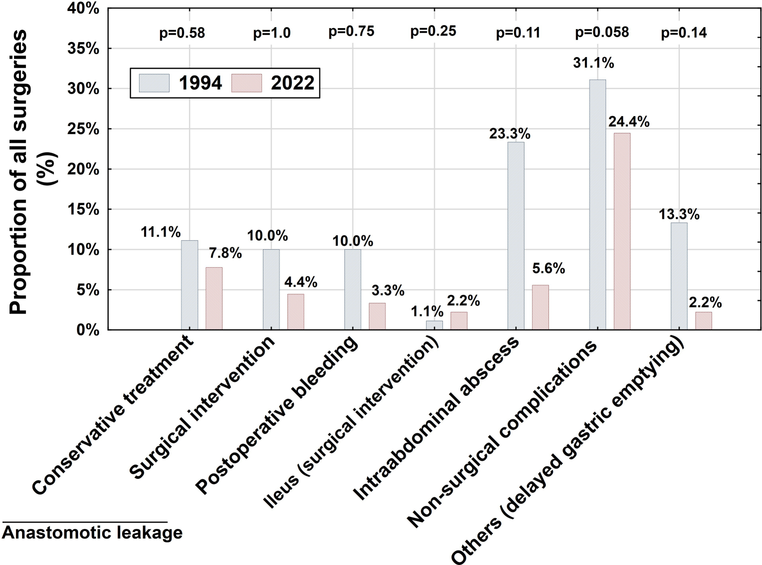 There was no significant change in the number of postoperative complications observed in 1994 vs. 2022. However, there were numerous improvements realized in perioperative care. A multidisciplinary treatment approach is universal, and patients receive personalized and risk-adapted treatment strategies combining surgery, chemotherapy, and radiation therapy as needed [18, 19]. Also, postoperative care was further developed into a multidisciplinary task, as enhanced recovery after surgery (ERAS) protocols have been widely implemented to improve recovery times and outcomes for gastric cancer surgery patients. In the case of postoperative complications, the management of complex cases is carried out by radiologists, gastroenterologists, and surgeons on a multidisciplinary basis. In combination with advanced surgical standards, all these factors contribute to the significantly lower mortality rate of 0.4% vs. 8.4% in 1994 (p < 0.00001).