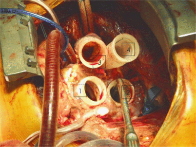 Intraoperativer Situs nach Resektion beider Ventrikel. Atriale Manschetten sind aufgenäht, ebenso Ausflusstraktprothesen an die Aorta ascendens bzw. den Truncus pulmonalis. Über diese Cuffs werden die künstlichen Ventrikel mit den Vorhöfen bzw. mit Aorta und Truncus pulmonalis konnektiert. 1 Rechte Vorhofmanschette; 2 linke Vorhofmanschette; 3 Prothese Aorta ascendens; 4 Prothese Truncus pulmonalis