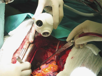 Die Ausflusstraktprothesen mit ihren Konnektoren werden in End-zu-End-Technik mit der aszendierenden Aorta und dem Truncus pulmonalis anastomosiert. Auf eine absolute Hämostase muss bei allen Anastomosen geachtet werden, da sie nach Einbringen der Pumpkammern nicht mehr einsehbar sind und potenzielle Blutungen nachträglich nur mit extremem Aufwand saniert werden können (Abb. 1).