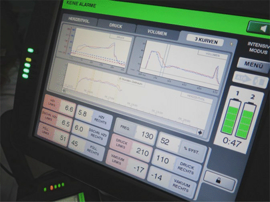 Display des Companion-II-Antriebs (innerklinische Verwendung). Rechts unten finden sich die Parameter, die intraoperativ eingestellt werden und praktisch nicht mehr verstellt werden (Frequenz, Systolendauer, Treibdruck und Vakuum für beide Ventrikel), links unten die variablen Parameter (Herzzeitvolumen und Füllung beider Ventrikel). Die drei Graphiken oben zeigen Druck und Volumen im rechten (blaue Kurve) und linken (rote Kurve) Ventrikel sowie das Herzzeitvolumen über die Zeit
