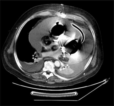 Computertomographie des Thorax bei klinischen Zeichen einer beginnenden Perikardtamponade. Die artifiziellen Pumpkammern sind von einem breiten Hämatomsaum umgeben. Gut sichtbar ist auch der intrathorakale Verlauf der Druckleitung des linken Ventrikels. Nebenbefund: beidseits Pleuraergüsse
