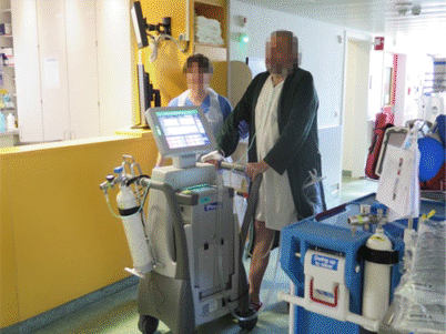 Mobilisation des Patienten auf der Intensivstation am Companion-II-Driver (nicht am portablen „Freedom Driver“, der nur 6 kg wiegt, außerklinisch zum Einsatz kommt und vom Patienten nicht in seinen Parametern verändert werden kann)