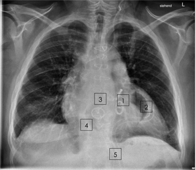 Röntgenuntersuchung des Thorax am 78. postoperativen Tag vor Entlassung: 2 Kippscheibenprothesen (1) des linken Ventrikels (2); 2 Kippscheibenprothesen (3) der rechten Pumpkammer (4); Druckleitungen durch die Bauchdecke (5)