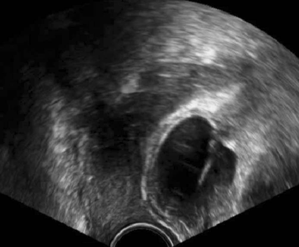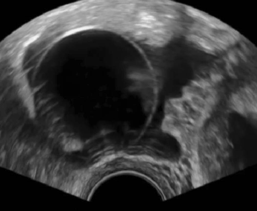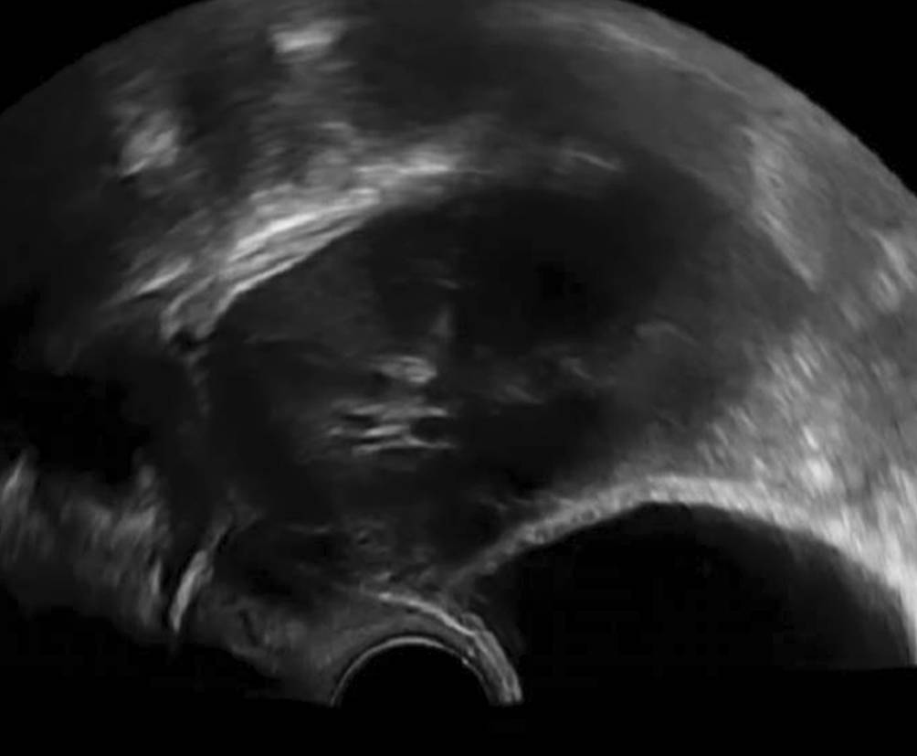 Spätestens beim Einbringen der Vaginalsonde in die Scheide sollte bei der Untersuchung ein liegender Blasenkatheter aufgefallen sein, und das von ihm hervorgerufene Bild einer kreisrunden Struktur in dem Bereich vor dem Uterus sollte nicht allzu viel Staunen auslösen (Abb. 1). Wenn etwas Harn in der Blase ist, ist das Bild sofort plausibel (Abb. 2), wenn nur der Katheter in der Blase liegt, kann dies zunächst verwirren, wenn man nicht daran denkt.