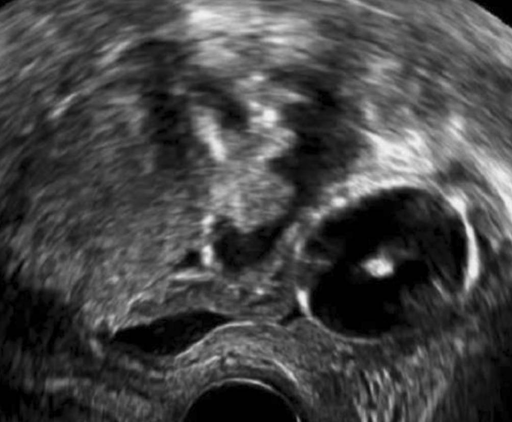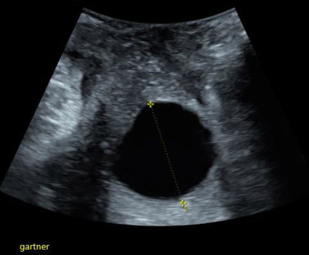 Kreisrunde, homogen echodens demarkierte, echoarme Struktur mit zentralem echodensem Streifen anterior des Uterus gelegen … was ist das?