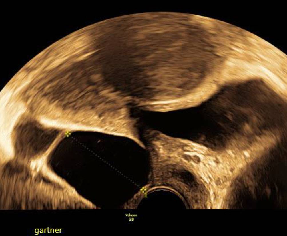 Gartner-Gang-Zysten sind im Prinzip harmlos, das Innere der Zysten ist meist dünnflüssig, kann aber auch gallertartige Konsistenz haben [4]. Selten – und dann eher im jugendlichen Alter – können sie sehr groß werden [5]. Es gibt einzelne Fallberichte von malignen Prozessen im Vaginalbereich, die aus Gartner-Gang-Zysten entstanden sein sollen [6, 7]. Beobachten mittels Bildgebung ist bei symptomlosen Patientinnen einer Punktion oder Exzision auf jeden Fall vorzuziehen (Abb. 5 und 6).