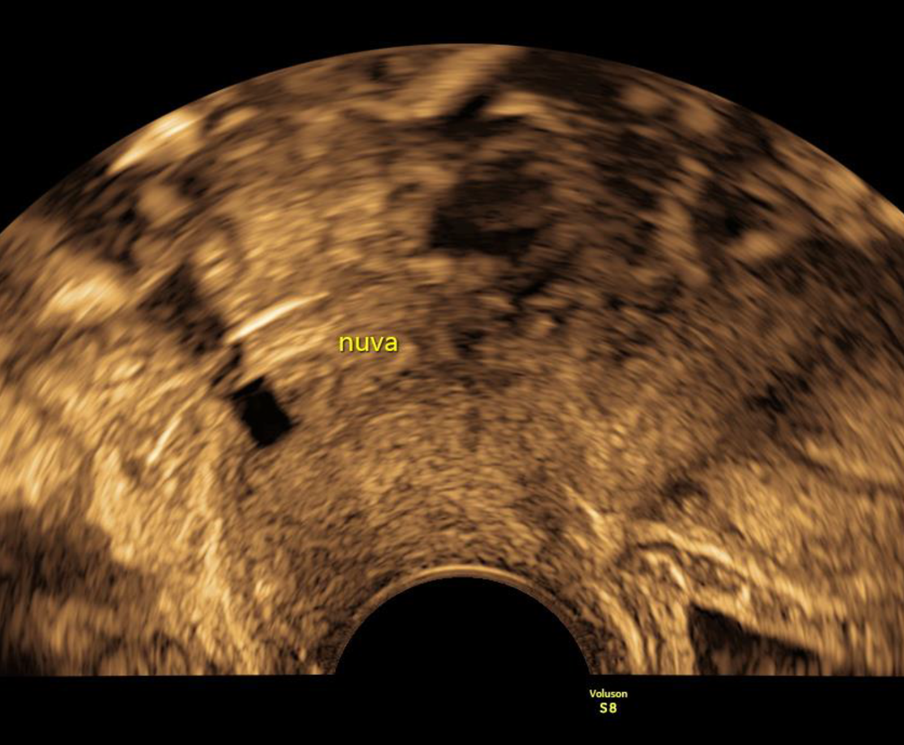 Ein NuvaRing imponiert als rechteckiger, echoarmer Block unmittelbar hinter der Zervix