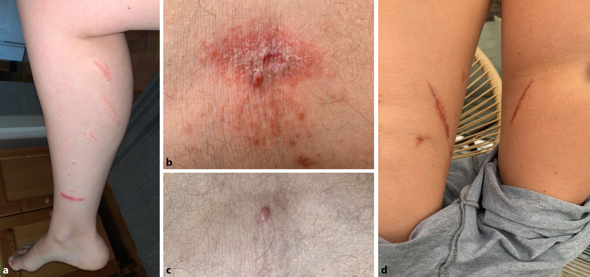 a Dermatitis linearis lesions on the calf of a woman 4 days after exposure to Paederus balcanicus. b Papulovesicular exanthema with superficial necrosis in the back of the knee of a man 9 days after exposure to Paederus balcanicus. c Follow-up picture of the lesion shown in B showing slight residual hyperpigmentation 7 months after beetle exposure. d Mirror lesions on the inner thighs of a 9-year-old child 9 days after exposure to Paederus balcanicus
