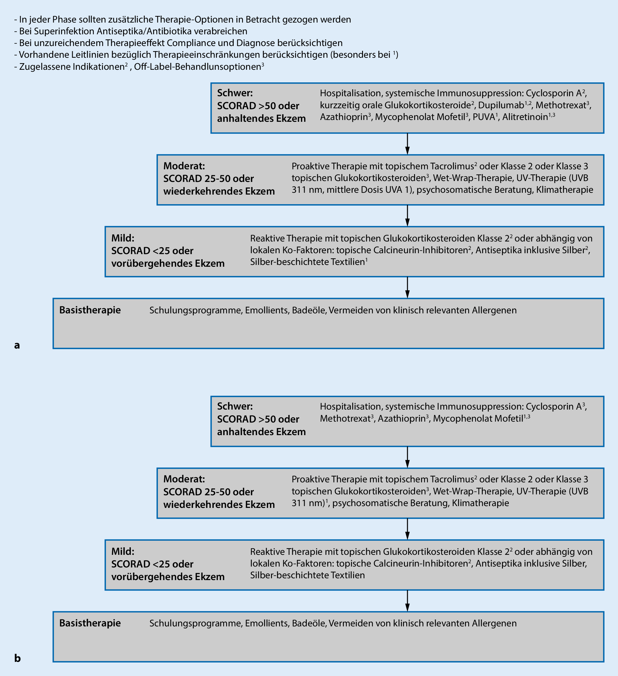 Behandlungsempfehlungen für Erwachsene und Kinder mit atopischem Ekzem. a Behandlungsempfehlungen für erwachsene AD-Patienten. b Behandlungsempfehlungen für Kinder mit AD. (Mod. nach [10])