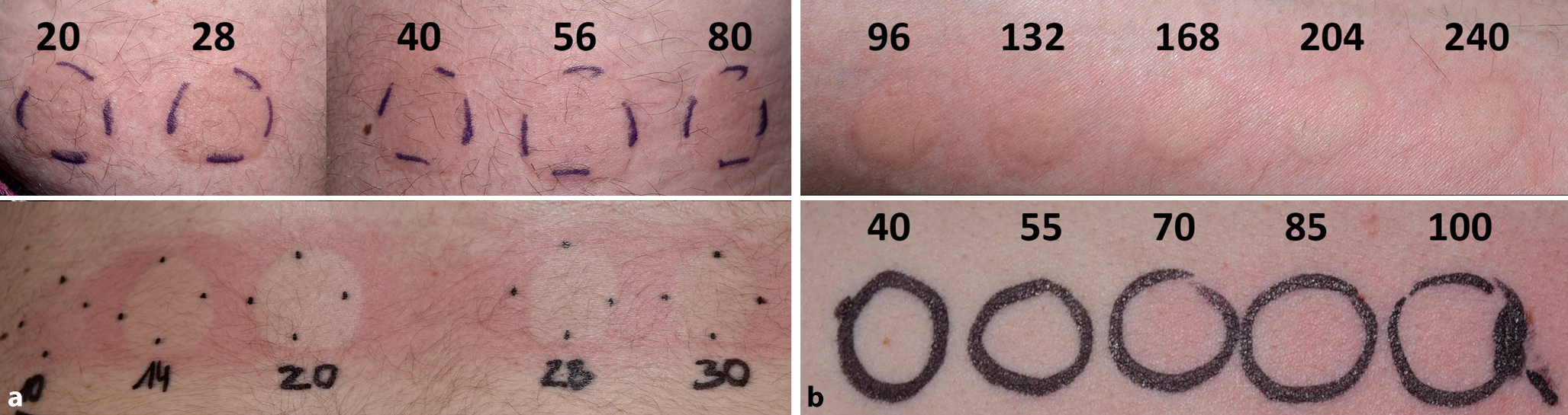 Phototestung vor Therapiebeginn mit Omalizumab. a Testreihe mit UV‑A (Angaben in J/cm2): positives Testergebnis nach Bestrahlung, minimale urtikarielle Dosis (MUD) bei 14 J/cm2. b Testreihe mit UV‑B (Angaben in mJ/cm2): positives Testergebnis nach Bestrahlung, MUD bei 85 mJ/cm2