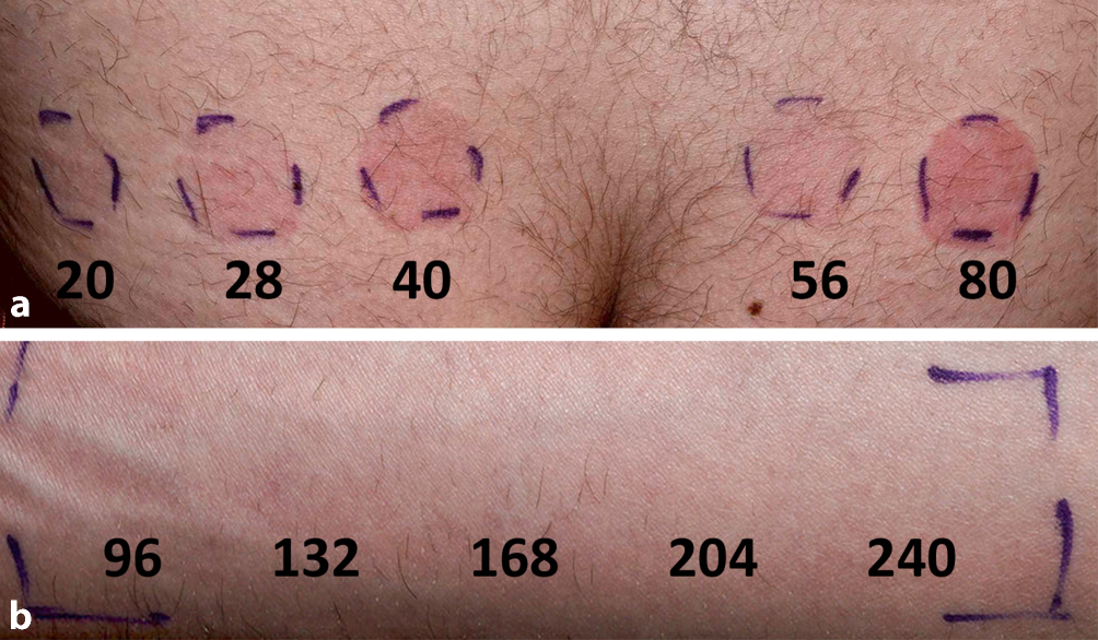 Erste Reaktionen können bereits unmittelbar nach Bestrahlung beobachtet werden, jedoch zeigt die Ablesung nach 20 min häufig eindeutigere Ergebnisse. Die geringste Dosis, welche eine urtikarielle Sofortreaktion hervorruft, wird als minimale urtikarielle Dosis (MUD) bezeichnet. Um möglichst unverfälschte Ergebnisse zu erhalten, sind Antihistaminika vor dem Phototest abzusetzen [1, 13]. Die minimale Erythemdosis (MED), die Lichtdosis, welche benötigt wird, um eine erythematöse Reaktion nach 24 h zu provozieren, ist bei der SU üblicherweise im Normbereich [3].