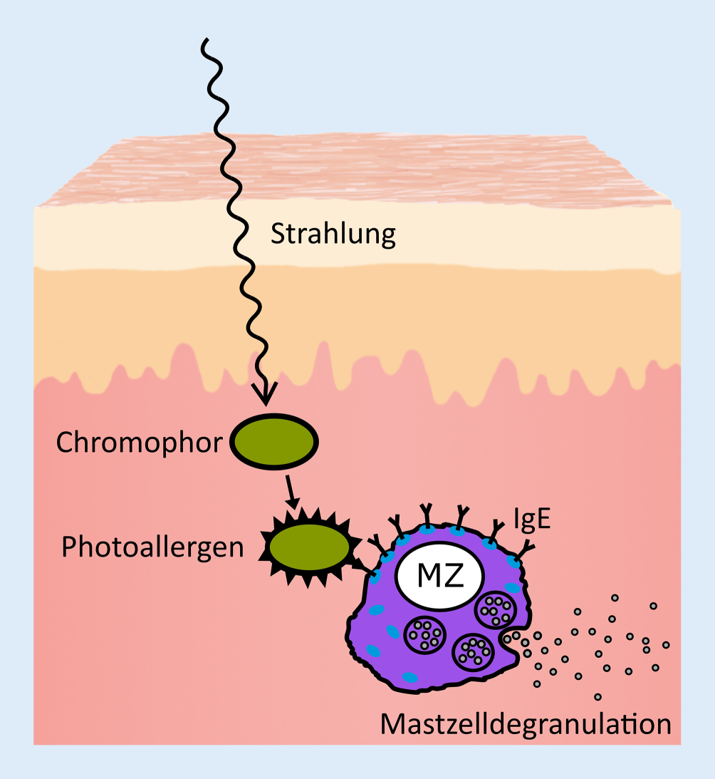 Die genaue Pathogenese der SU ist nach wie vor nicht vollständig geklärt, die gängigste Theorie basiert auf der Existenz einer inaktiven Vorstufensubstanz, einem Chromophor, welches durch Licht aktiviert und dadurch zu einem immunologisch aktiven Photoallergen wird. In weiterer Folge kommt es zu einer Bindung von IgE an das entstandene Photoallergen und einer daraus resultierenden Immunreaktion durch Mastzelldegranulation (Abb. 3; [9]). Die klinische Ausprägung der Symptomatik steht mit der Intensität und Dauer der Exposition in Zusammenhang. Geringe Belastungen können nur leichte Symptome wie Brennen, Juckreiz oder Hautrötungen hervorrufen, urtikarielle Reaktionen treten meist erst bei längerer Exposition auf [10].