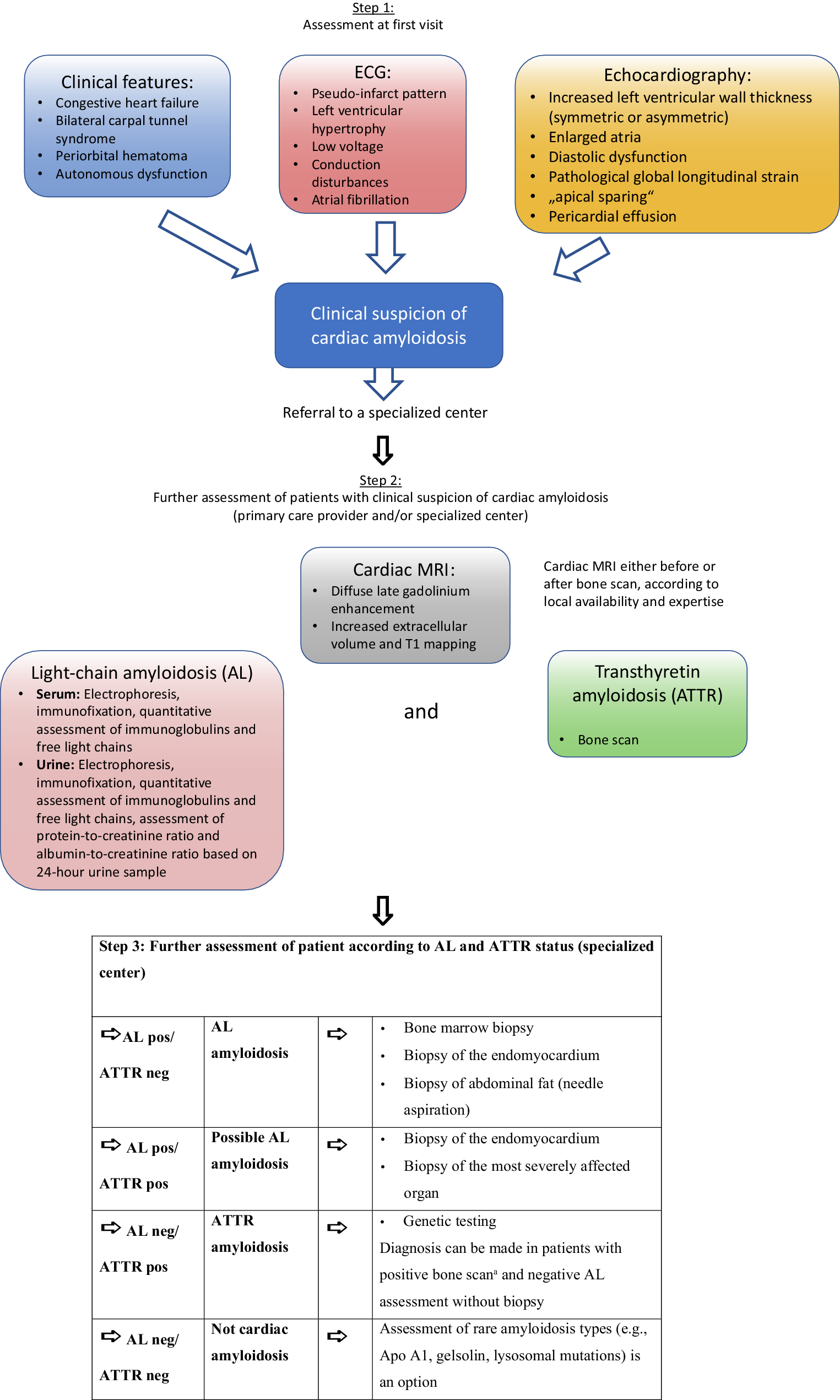 This guide provides a diagnostic algorithm for patients with cardiac amyloidosis that is based on the most recent literature and the clinical experience of the authors. A critical aspect is the interdisciplinary collaboration between cardiologists, hematologists, neurologists, nephrologists, geneticists, radiologists, specialists in nuclear medicine, pathologists, and specialists in further disciplines.