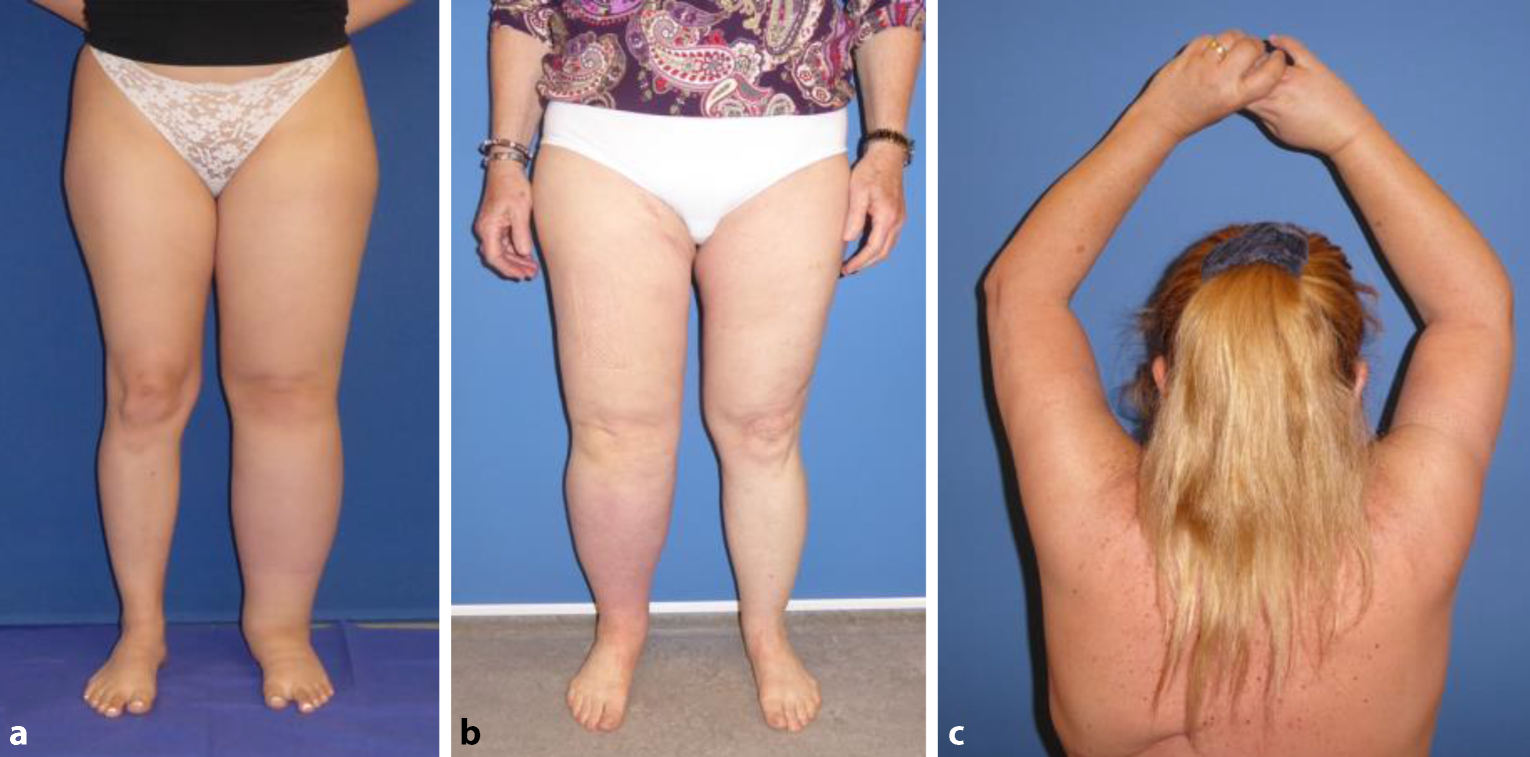 a Idiopathisches Lymphödem der linken unteren Extremität bei einer 19-jährigen Frau. b Lymphödem nach Uteruskarzinom mit Lymphknotendissektion der rechten unteren Extremität bei einer 62-jährigen Frau C: Lymphödem nach Mastektomie und Axilladissektion der rechten oberen Extremität bei einer 58-jährigen Frau