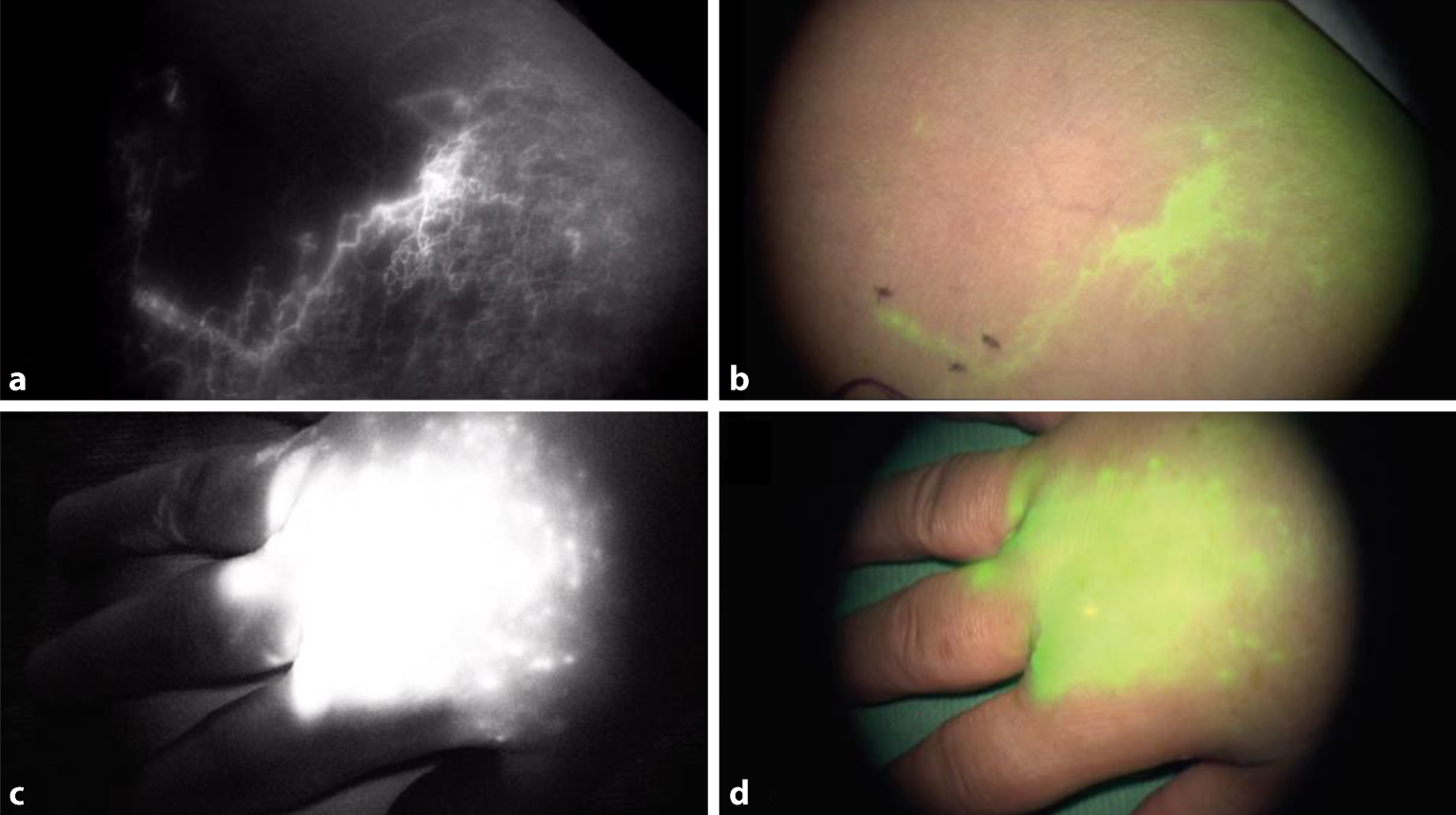 Indocyaningrün (ICG) ist ein autofluoreszierender Stoff. Es dient der Echtzeiterfassung von ausschließlich oberflächlichen Lymphgefäßen. Die Applikationsstellen von ICG sind gleich zur Lymphszintigraphie. Nach ausreichender Wartezeit können mittels Infrarotkamera, die Lymphgefäße dargestellt werden (Abb. 2). Ist der Lymphabfluss gestört erfolgt die Verteilung von ICG als diffuser „Backflow“ über die Haut.