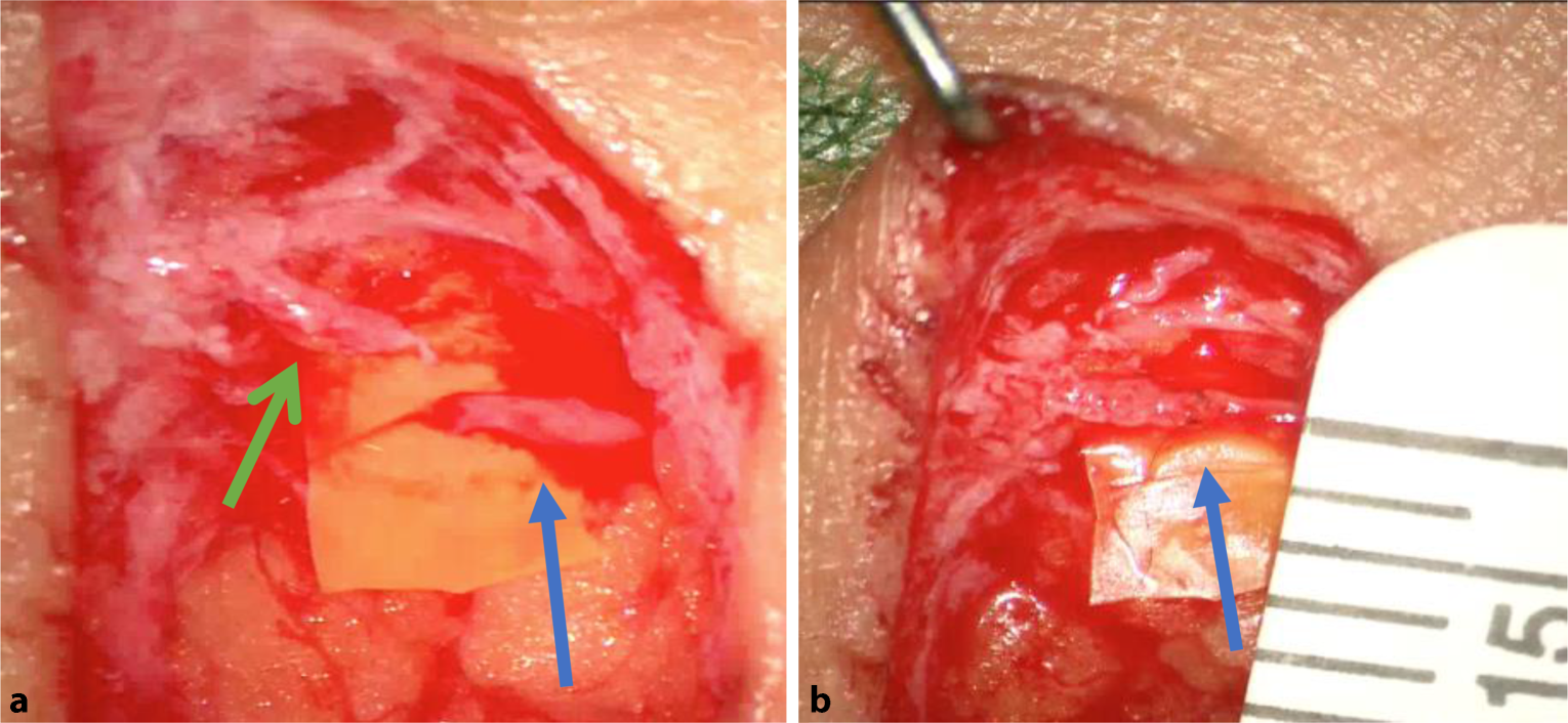 a Präparation des Lymphgefäßes (grüner Pfeil, Größe ca. 0,5 mm) und der Vene (blauer Pfeil, Größe ca. 0,5 mm), b Anlage der Lymphovenösen End-zu-End Anastomose (blauer Pfeil). Lineal zum Größenvergleich