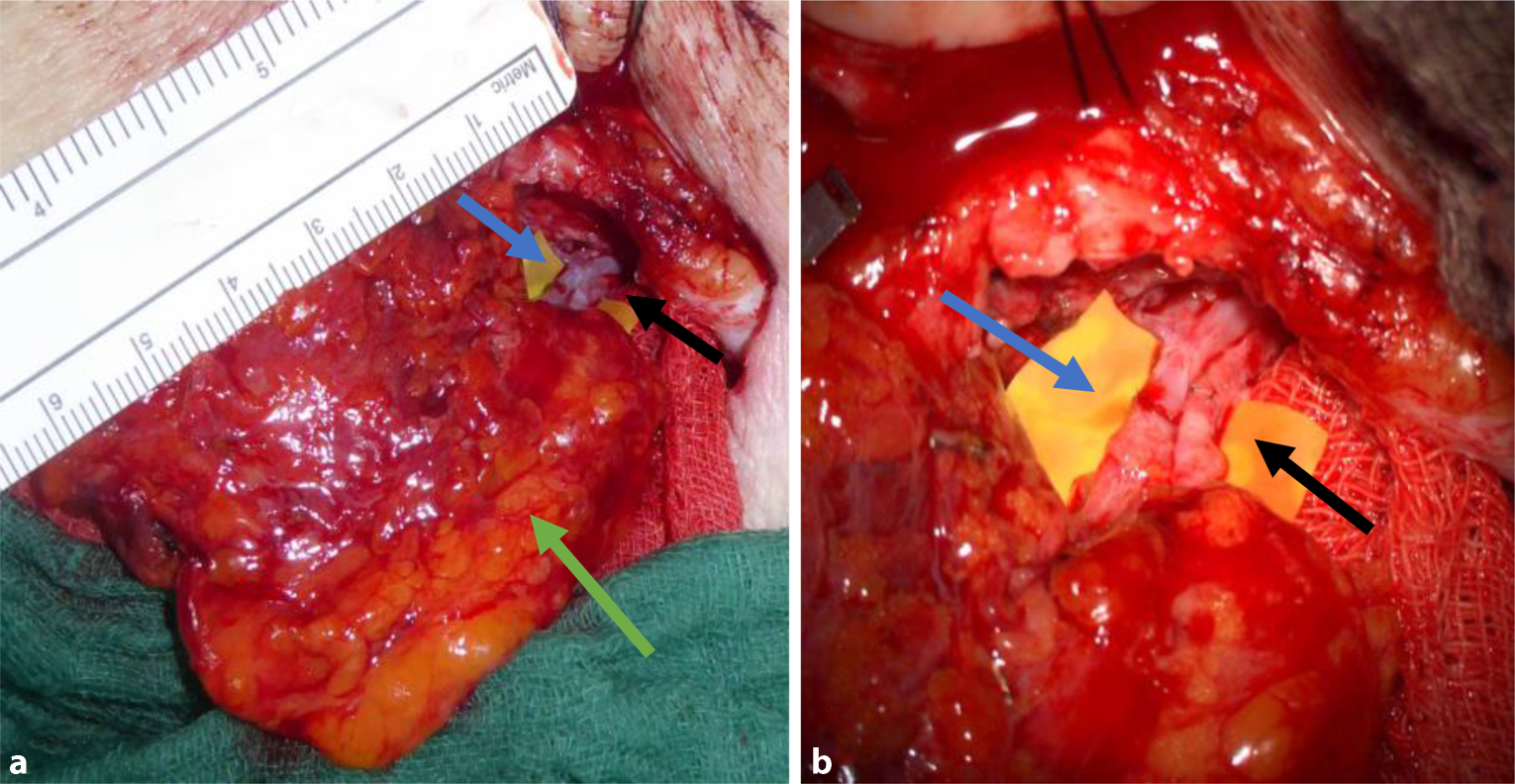 a Vaskularisierter Lymphknotenlappen (grüner Pfeil) vor dem Einnähen ins Empfängerbett. Im Hintergrund sind die arterielle (schwarzer Pfeil) und venöse (blauer Pfeil) Anastomose sichtbar, b Arterieller (schwarzer Pfeil) und venöser (blauer Pfeil) Anschluss des VLNT
