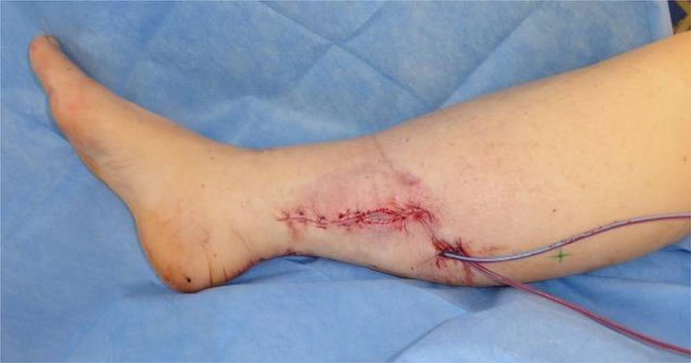 Je nach Empfängerstelle kann es notwendig sein den Hautmantel des Lymphknotenlappens zur Integumenterweiterung mit zu transferieren. Dies ist bspw. am Handgelenk, oder Knöchel notwendig. An Lokalisationen mit mehr Weichteilmantel kann der Lymphknotenlappen entweder vollständig eingebracht oder auch mit Spalthaut bedeckt werden (Abb. 5).