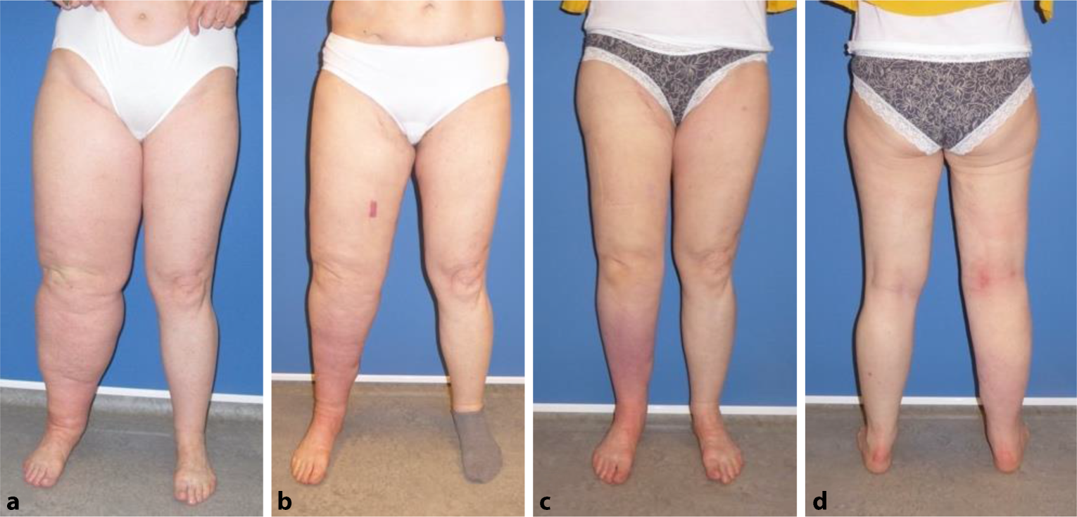 Eine manuelle Lymphdrainage sollte, wenn möglich täglich, ab dem ersten postoperativen Tag im stationären Bereich erfolgen. Nach der Entlassung sollte eine Lymphdrainage alle zwei Tage für die ersten 6 Wochen durchgeführt werden. Danach muss diese für weitere 3 Monate zweimal wöchentlich erfolgen. Postoperativ sollte eine mäßige Kompression der entsprechenden Extremität mit Kurzzugbandagen, mit nicht zu starkem Zug außerhalb der KPE, etabliert und Patienten sollten nach der Entlassung mit Flachstrick Kompressionswäsche nach Maß der Klasse II versorgt werden. Zwölf Monate nach dem Eingriff kann ein sukzessives Entwöhnen der Kompressionswäsche erfolgen. Regelmäßige ambulante Kontrollen sind initial zur Überprüfung des Fortschrittes notwendig (Abb. 6).