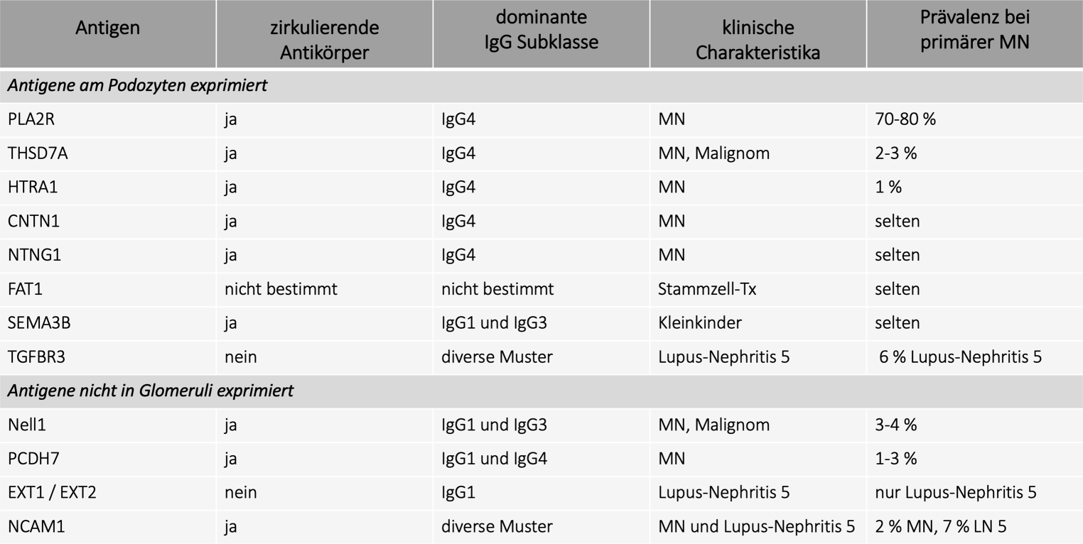 Die MN ist eine Immunkomplex-Glomerulonephritis. Die häufigsten Autoantigene, richten sich gegen den Phospholipase-A2-Rezeptor (PLA2R) und gegen Thrombospondin type‑1 domain-containing protein 7A (THSD7A), welche physiologisch in den Podozyten exprimiert werden [1]. In den letzten Jahren sind mehrere neue Autoantigene entdeckt worden, manche davon werden allerdings nicht in den Glomeruli exprimiert, und deren routinemäßige Bestimmung ist derzeit nicht möglich (siehe Abb. 1). Weitere Antigene werden fortlaufend identifiziert, deren pathophysiologische Bedeutung in der Genese der MN derzeit aber z. T. noch unklar ist.