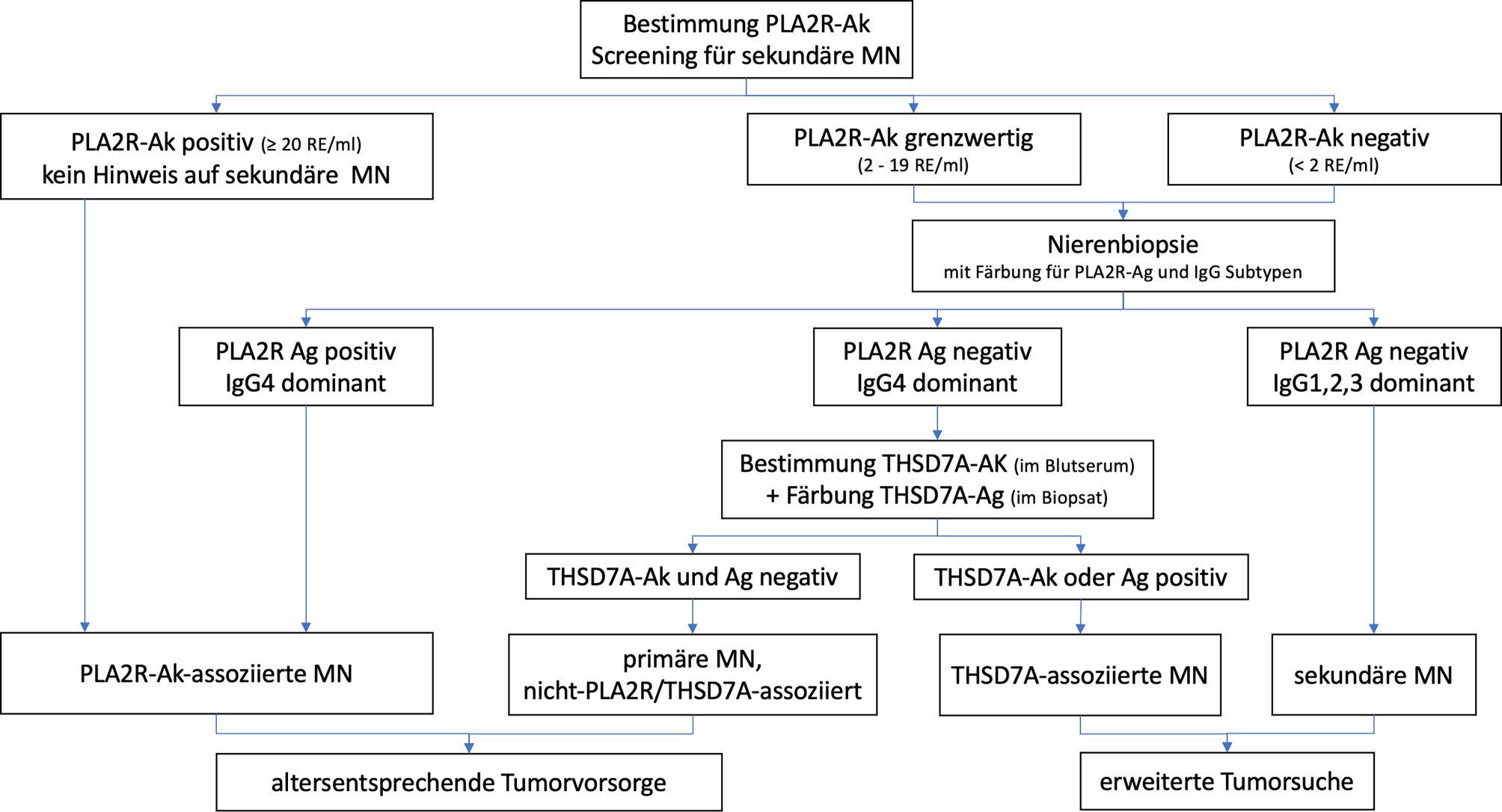 Wir empfehlen aber bereits jetzt bei PLA2R-Ak-Nachweis im Serum und/oder immunhistochemisch/IF positives PLA2R-Antigen (PLA2R-Ag) in den abgelagerten Immunkomplexen in der Nierenbiopsie, von einer PLA2R-Ak-assoziierten MN und entsprechend bei z. B. THSD7A-Nachweis von einer THSD7A-Ak-assoziierten MN zu sprechen. Bestimmungen der PLA2R-Ak im Serum sowie Nachweis des PLA2R-Antigens in der Nierenbiopsie gehören zu Standard-Untersuchungen, wobei die Bestimmung der anderen Antigene bis dato nur in spezialisierten Laboren stattfindet. Bei primärer MN können in ca. 75 % der Fälle PLA2R-Ak und in 5–10 % THSD7A-AK (bei PLA2R-Ak-negativen Patienten) nachgewiesen werden.