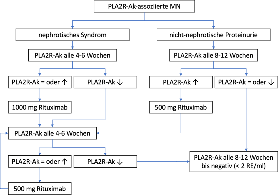 Bei PLA2R-Ak-negativer MN fehlt leider ein guter Serumparameter, um die Effektivität der Immunsuppression zu monitieren. Wir schlagen deshalb vor, bei PLA2R-Ak-negativer MN innerhalb der ersten zwei Wochen nach der initialen Verabreichung von 1000 mg Rituximab B‑Zellen mit Durchflusszytometrie/Leukozytentypisierung die CD19 positiven Zellen quantitativ im Blut zu bestimmen, um über die B‑Zell-Depletion einen indirekten Hinweis zur Effektivität der Therapie zu bekommen. Bei einem Messwert ≥ 5/mm3 empfehlen wir eine weitere Rituximab-Gabe mit 500 mg; dieses Vorgehen kann wiederholt werden bis zu einer maximalen Dosis von 2000 mg Rituximab innerhalb von 4 Wochen. Je nach klinischem Verlauf der Proteinurie können nach jeweils 6 Monaten nochmals 500–1000 mg Rituximab verabreicht werden. Auch hier können ggf. die B‑Zellen einen Hinweis auf eine suffiziente Dosierung geben, aber B‑Zellen korrelieren generell per se nicht gut mit dem Krankheitsverlauf und ihre Bestimmung dient daher nur als Hilfsbefund zur suffizienten Rituximab-Dosierung zu werten.