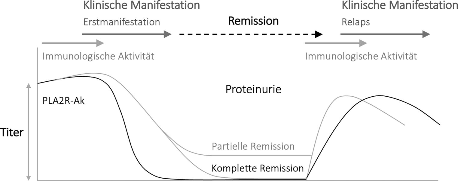 Die Entdeckung der PLA2R-Ak hat das Vorgehen bei MN revolutioniert, da diese bei Positivität diagnostisch sichernd sind und auch das weitere therapeutische Vorgehen bestimmen, sodass eine hochindividuelle Therapie möglich ist. Zum einen weist ein im Verlauf fallender PLA2R-Ak Titer auf eine Spontanremission hin, zum anderen kann eine immunsuppressive Therapie nach PLA2R-Ak Verlauf adaptiert werden. Dies ist insofern von großer Wichtigkeit, da die immunologische Aktivität (PLA2R-Ak Bildung) und die klinische Manifestation (Proteinurie) zeitverzögert sind (Abb. 5). Des weiteren kann es im Krankheitsverlauf zu irreversiblen glomerulären Strukturalterationen gekommen sein, welche zu einer persistierenden Proteinurie bei fehlender immunologischer Aktivität führen.