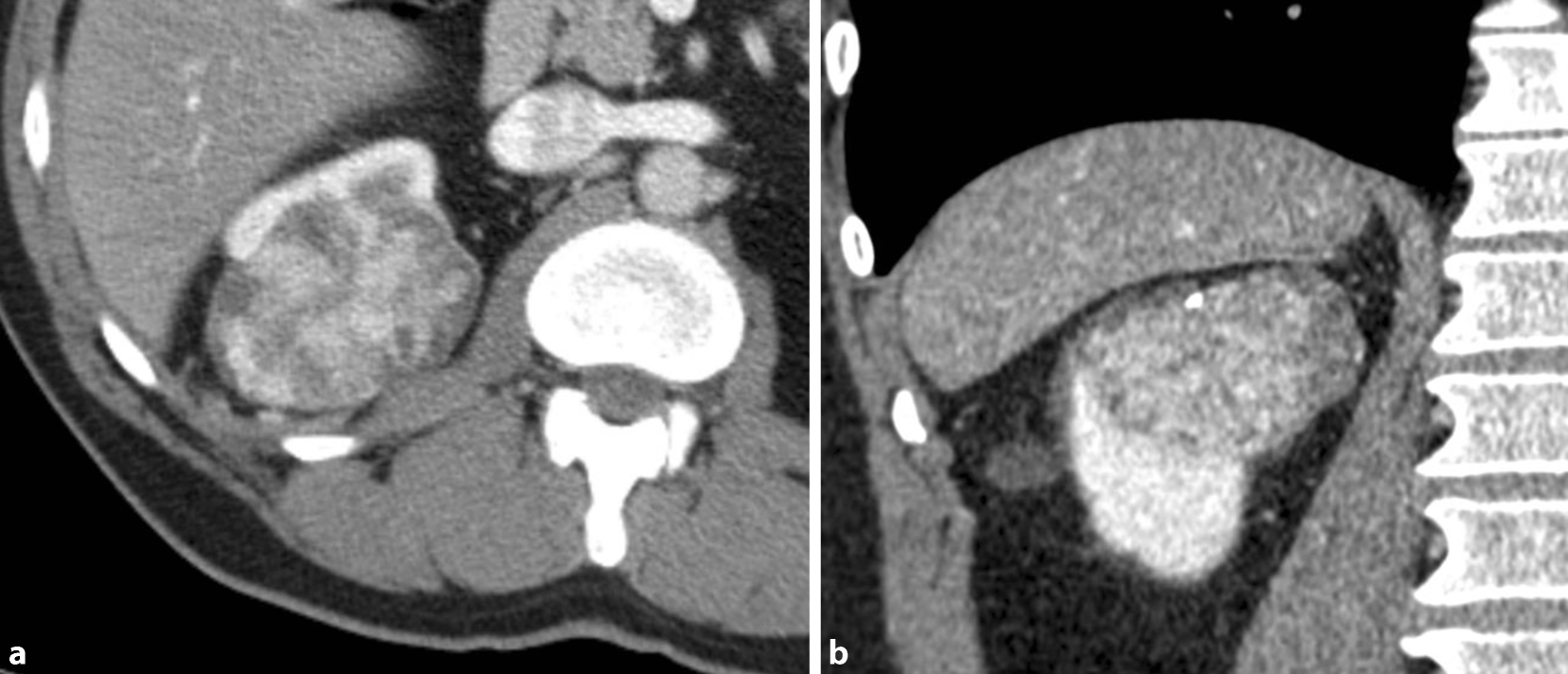 Die Rolle der Biopsie in der Diagnostik von renalen Raumforderungen wird kontrovers diskutiert. Die Biopsie kann bei radiologisch unklaren, soliden Tumoren wichtige Informationen liefern. Jedoch bleibt auch nach Biopsie eine gewisse diagnostische Unsicherheit, weshalb in Zeiten der minimal-invasiven Nierenteilresektion zunehmend auf die Biopsieentnahme verzichtet wird. Eine Indikation besteht jedoch vor ablativen Verfahren sowie bei der Auswahl eines bestmöglichen onkologischen und chirurgischen Therapieregimes beim metastasierten Stadium [15, 16]. Gemäss den aktuellen Richtlinien sollte eine Biopsie in Lokalanästhesie ultraschall- oder CT-gesteuert im koaxialen Verfahren durchgeführt werden. Das Risiko der Tumorzellverbreitung bei diesem Verfahren ist selten und von unklarer Signifikanz [17]. Zystische Raumforderungen unklarer Dignität sollten aufgrund der erhöhten Rate eines „sampling error“ nicht biopsiert werden [18, 19].